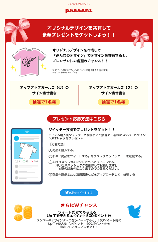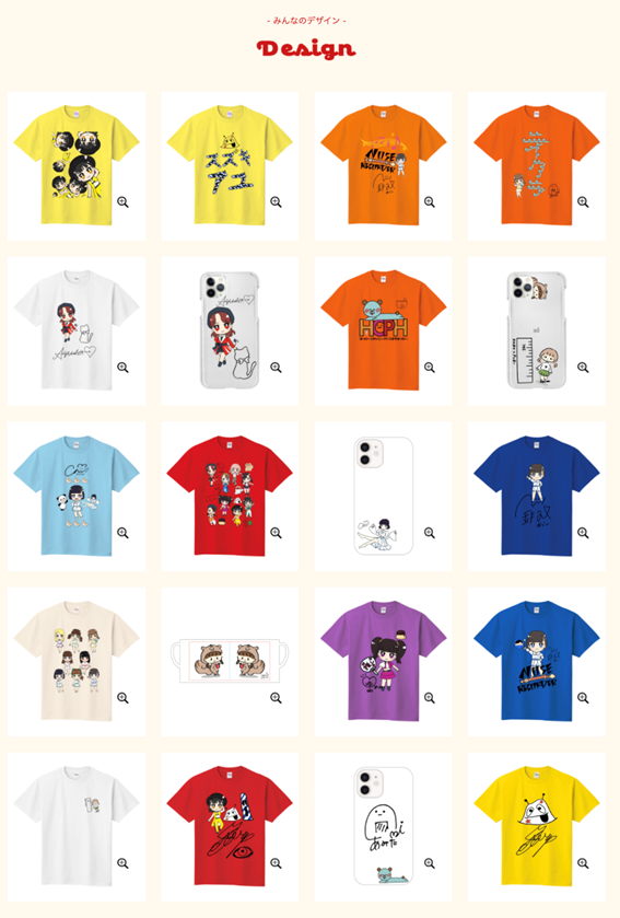 オリジナルのアイテムを作成して特設サイト内の「みんなのデザイン」にデザインを共有すると、抽選でメンバーのサイン入りTシャツをプレゼントします。