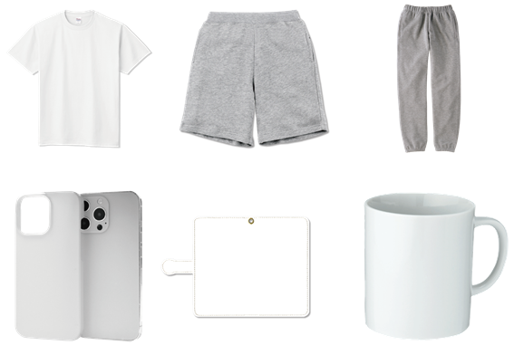 Tシャツやスウェットパンツをはじめ、マグカップなど雑貨類などカスタマイズできるアイテムを豊富に取り揃えております。