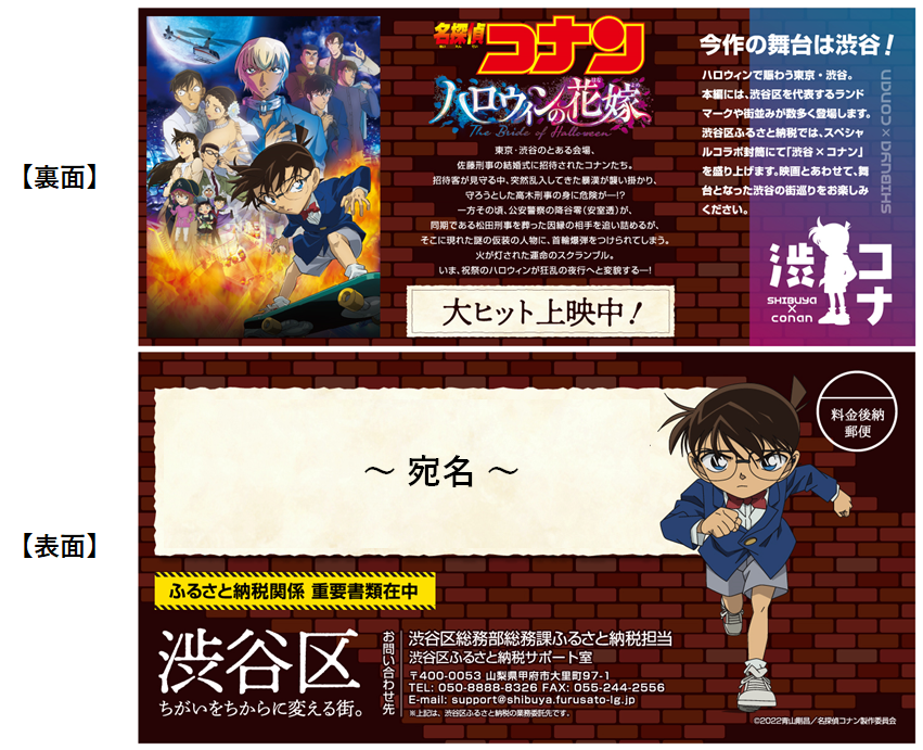 2022年4月15日(金)~7月31日(日)までの期間中に、ふるさとパレットWebサイトから東京都渋谷区に寄付申込をされた方全員に、劇場版「名探偵コナン ハロウィンの花嫁」の公開を記念したオリジナルデザインの封筒で寄付受領証明書を発送します。