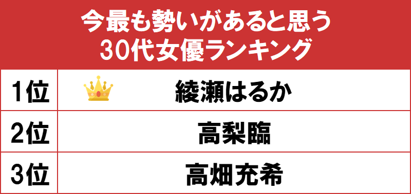 「日本アカデミー賞」で二度にわたって優秀主演女優賞を受賞するなど、数々の賞に輝いている綾瀬はるかが、1位となりました。