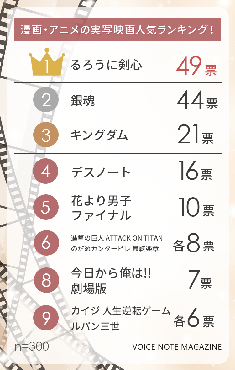 人気の漫画・アニメの実写化作品が多くランクインしました。