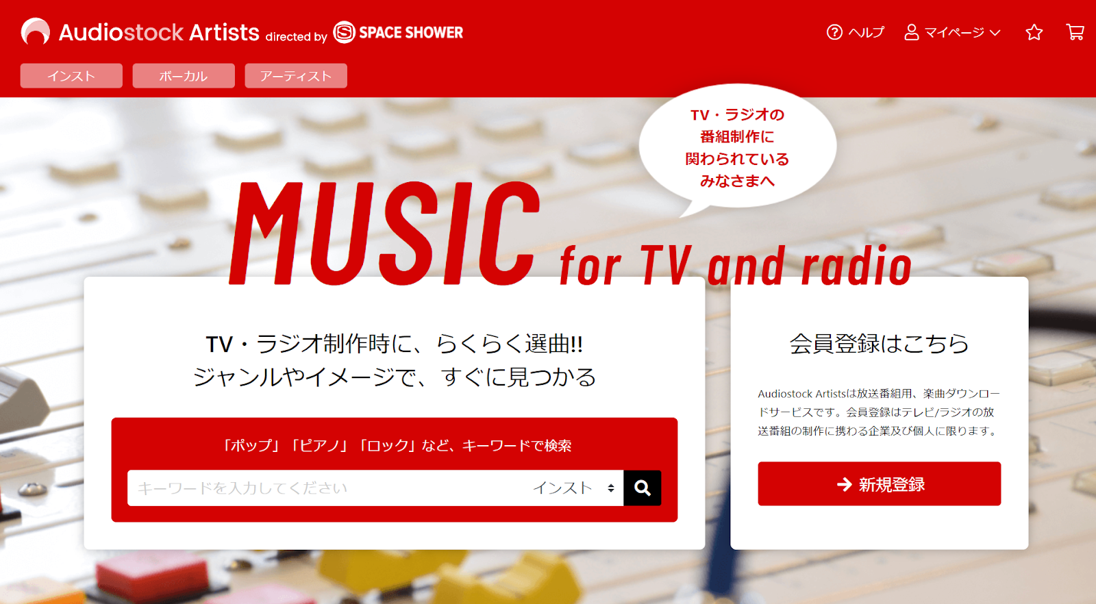 スペースシャワーネットワーク所属のアーティスト作品を含む、5,000曲以上の作品を提供。利用ユーザーは主にテレビ・ラジオ放送の制作に関わる法人・個人を対象としています。従来の放送番組制作における選曲作業の過程を、オンライン上で素早く検索が可能にすることで効率化し、作品の二次利用を促進することで、アーティストのさらなる収益拡大を目指します。