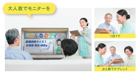 大人数でのレクリエーションや鑑賞会を実施する場合にはモニターに接続して大画面で視聴、少人数のグループで体操やクイズを楽しむ場合や個室で使用する場合には手軽にタブレット画面で視聴することができるなど、さまざまなシーンに合わせたご利用が可能となりました。片手に抱えられる軽量のタブレット型のため、施設内のさまざまな場所への持ち運びも容易に。シンプルでわかりやすい画面デザインにより、簡単なタッチ操作でコンテンツや機能を利用することができます。