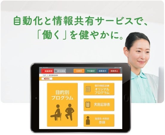 個別機能訓練に関するさまざまな業務をサポートすることで業務負荷を軽減。利用者様ごとのトレーニング結果が自動で記録され、加算算定に活用することが可能になり、さらにご本人やご家族への報告資料としても利用できます。また、ケアマネージャー様へ質の高い情報共有が可能となり、施設様のサービス品質自体の向上にも貢献します。個別機能訓練プログラムとして、理学療法士が監修した、利用者様の状態に適した目的別の訓練プログラムをご提供。専門知識がなくても利用者様に最適な訓練を実施できます。