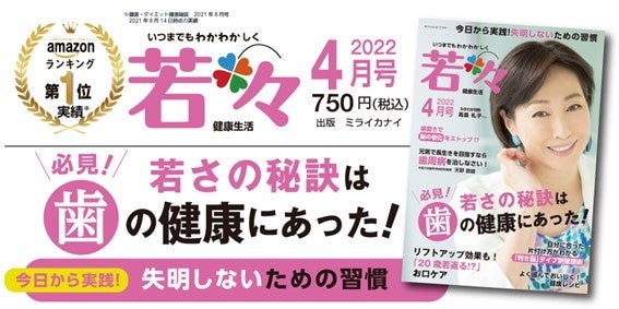 『若々』4月号では、「お口から若々しく健康に!」をテーマに、生活に役立つ情報をお届け。皆さまが「若々しく健康的な生活」を実現するためのお手伝いをいたします。いまや日本人の30〜60代の8割が罹患していると推定される歯周病。糖尿病から認知症まで歯周病が全身の病気の引き金に。今日から実践できる歯を守る健康法をお伝えしていきます。