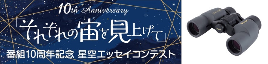 東京ガーデンテラス紀尾井町とVixenの提供でお送りする『東京プラネタリー☆カフェ』では、毎週多彩なジャンルのゲストを迎えて、宇宙・星空・月をテーマにした選曲とともに、宙トークをお届けしています。この春番組開始10周年を記念した特別企画を実施することが決定しました。この企画は、Vixen主催、東京ガーデンテラス紀尾井町協力の「それぞれの宙を見上げて」星空フォトコンテストと連動し、星空にまつわるエッセイを募集するもので、半年間に渡り、毎週1名の作品を番組で紹介していきます。エッセイが紹介された方には、星空観察におすすめの双眼鏡Vixen「アトレックライトⅡ 6倍30mm」をプレゼントします。さらに紹介作品は番組内で実際に篠原ともえが朗読します。応募の詳細などは、番組ホームページまで。ご応募お待ちしています。