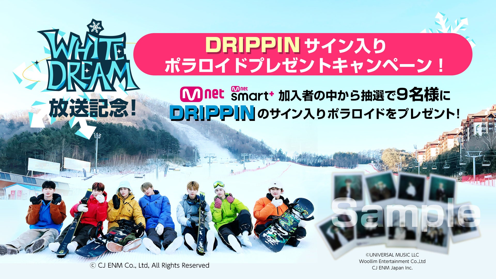 100%韓国エンターテインメントチャンネル「Mnet」および、日本初の韓国エンタメ動画配信サービス「Mnet Smart+」を運営するCJ ENM Japan株式会社(本社:東京都港区、代表取締役:崔起容〔チェ・ギヨン〕)は、DRIPPIN初の単独リアリティ番組「WHITE DREAM:DRIPPINの特別なスキーキャンプ」を4月7日から日本初放送・配信いたします。放送・配信開始を記念してDRIPPINサイン入りポラロイドプレゼントキャンペーンを実施しますので、お知らせいたします。