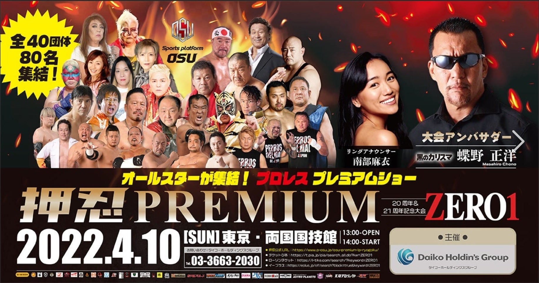 蝶野正洋が大会アンバサダーを務める『押忍 PREMIUM』4・10両国国技館大会は新日本プロレス、全日本プロレス、プロレスリングNOAHをはじめ40団体が参戦するオールスター級のイベントで全18試合が行われます。また、同大会は蝶野正洋の盟友の故・橋本真也が立ち上げたプロレスリングZERO1旗揚げ20周年&21周年記念イベントになります(20周年はコロナ禍で延期となり21周年と併せての開催)。