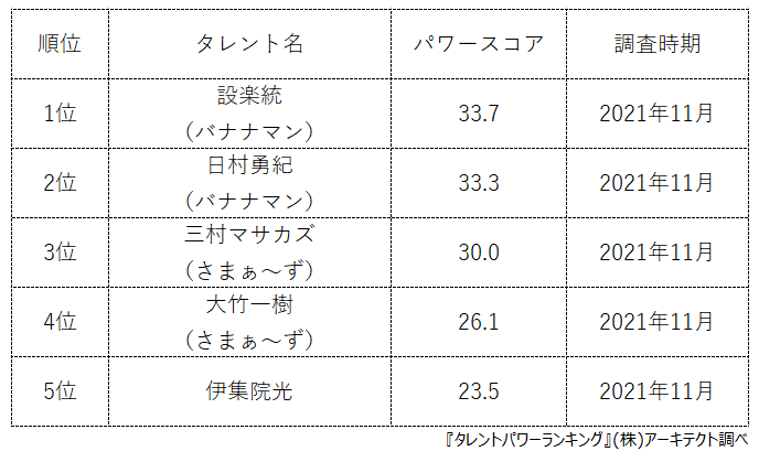 TOP5入りを果たしたお笑い芸人は、MCとして実力があり、多数のレギュラー番組と冠番組を持つお笑いコンビ「バナナマン」の設楽統と日村勇紀が1位、2位にランクイン。