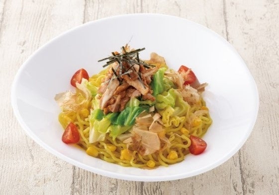【彩り野菜のまぜそば】ごま油香るタレを絡めた麺に、トマト、キャベツ、コーンの彩り野菜をたっぷりトッピングしました。