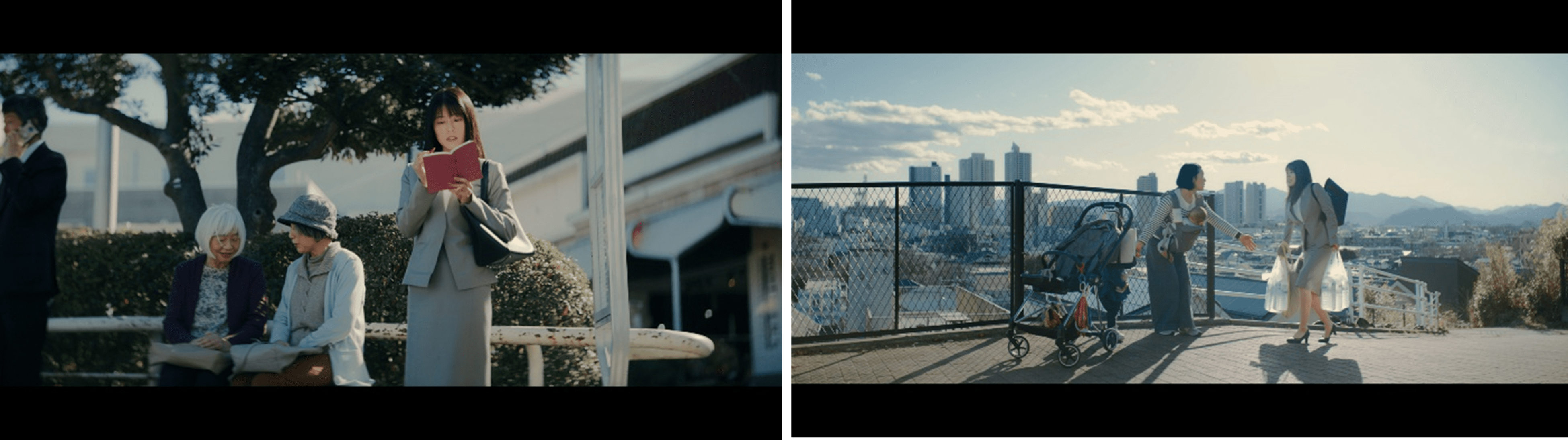 「行ってきまーす!」と仕事に出かけようと玄関で靴を履く有村さん。「あ、そうだ。」と思い出したように顔を上げると「みなみー!あれをあれしてさ、あれしとくんだよー!」と浜辺さんに声を掛けて家を出ます。「お姉ちゃんのお節介は、仕事では役に立つらしい。」と浜辺さんが語るように、有村さんは契約者一人ひとりの状況に応じた質問項目をノートにまとめて、日々契約者のもとへ訪問します。時には重い荷物を代わりに運んであげるなんてことも。JAのライフアドバイザーとして初めての訪問をした有村さんのあどけない表情から3年後、今日も契約者のもとへ訪れる有村さんの成長した姿に切り替わります。最後は、「この街は、今までも、これからも、お姉ちゃんのお節介で守られている。なんてね。」という浜辺さんのナレーションのもと、笑顔で挨拶をする有村さんのシーンで締めくくります。