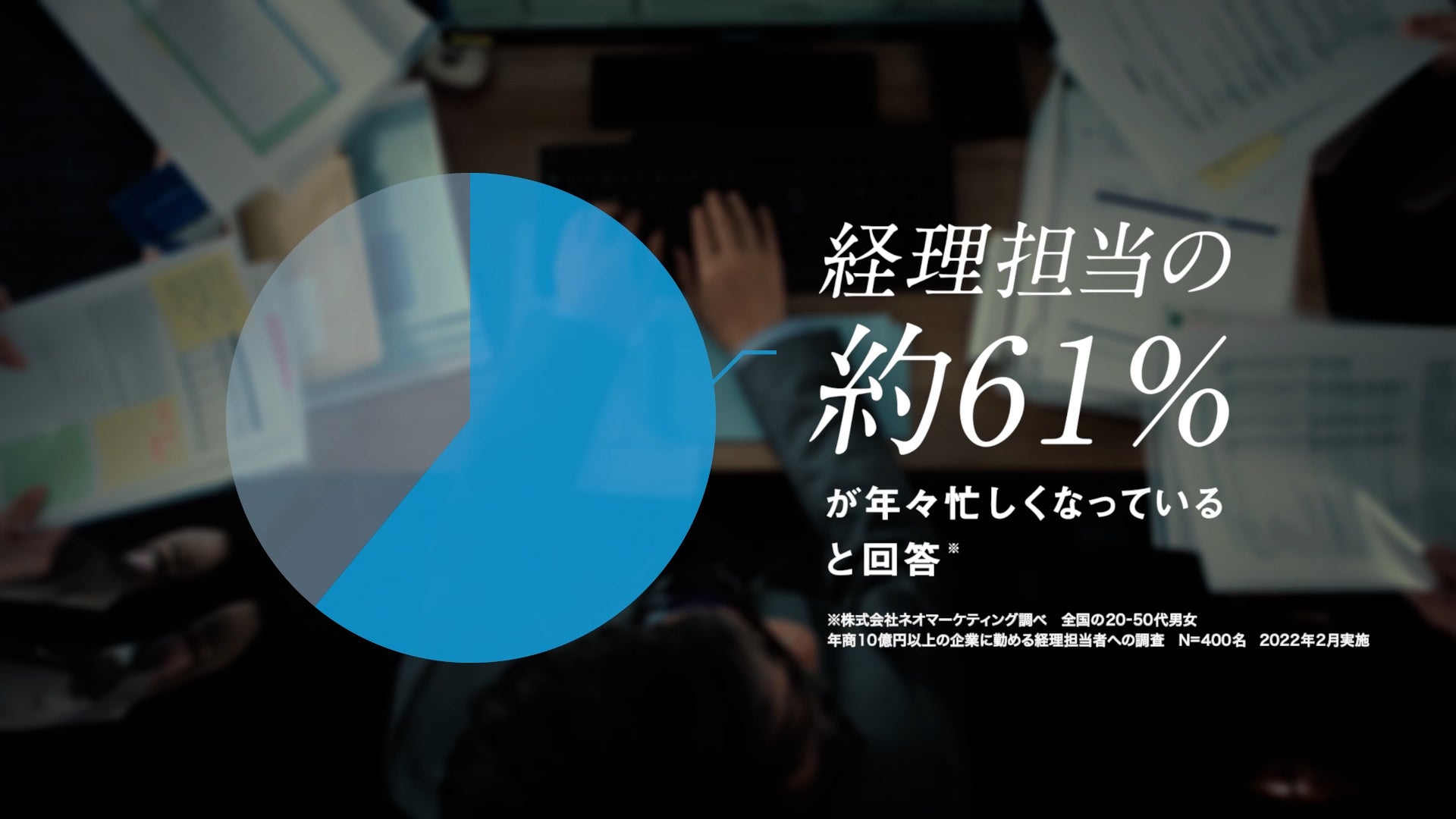 今回放映を開始する「経理の負担」篇、「請求トラブル」篇、「進まないDX」篇は当サービス初の全国版のTVCMとなります。本CMを制作するにあたり、企業に勤める経理の方を対象にした自社調査を実施しました。調査結果から、「経理担当の約61%が年々忙しくなっている」、「経理担当の95%がDXは進んでいないと回答」したこと等が判明し、負担の大きい経理の実態を元にしたCM内容としました。