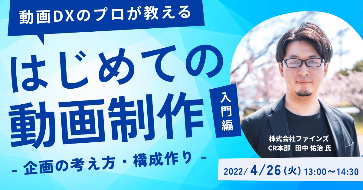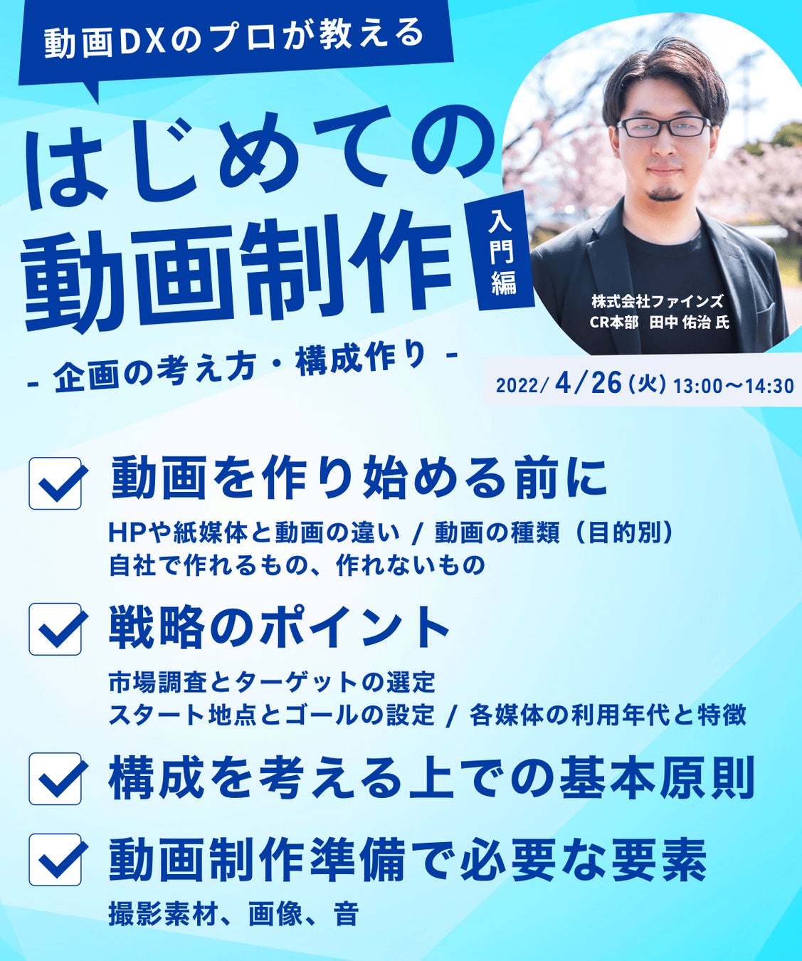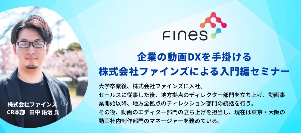 今回のオンラインセミナーでは、Videoクラウドを中心に企業のDX推進を支援する株式会社ファインズで、動画の編集と動画のクリエイティブ部門における撮影・編集チームの統括を担当する田中 佑治 様をゲストにお招きし「はじめての動画制作」をテーマに、動画の企画や構成における考え方の基本について詳しくお伺いします。