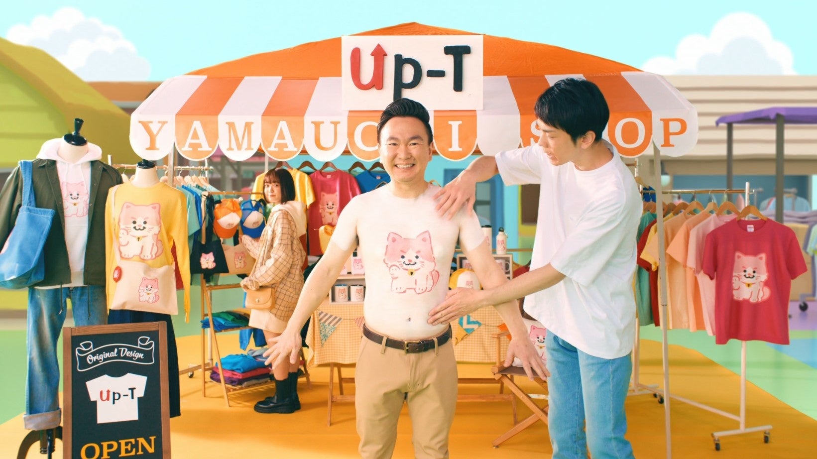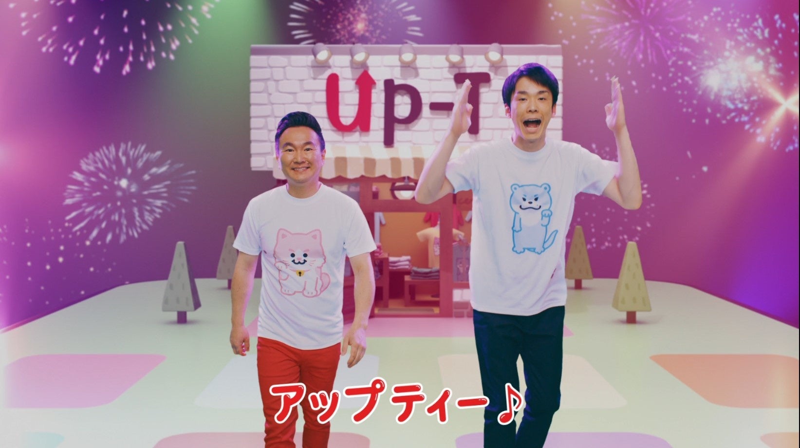 新CMの「歌モノ」篇では山内さんがまねきネコ、濱家さんがまねきカワウソを着用して登場。Up-Tのオリジナルソングに合わせ軽快に踊る濱家さん、一方山内さんは踊らず不思議な表情を浮かべています。さらに「ボディペイント篇」では山内さんがボディペイントでまねきネコのデザインのTシャツを着用しているような仕掛けに挑戦。「着てませんよね?」、「着てます」という2人のやりとりなど楽しいCMとなっています。