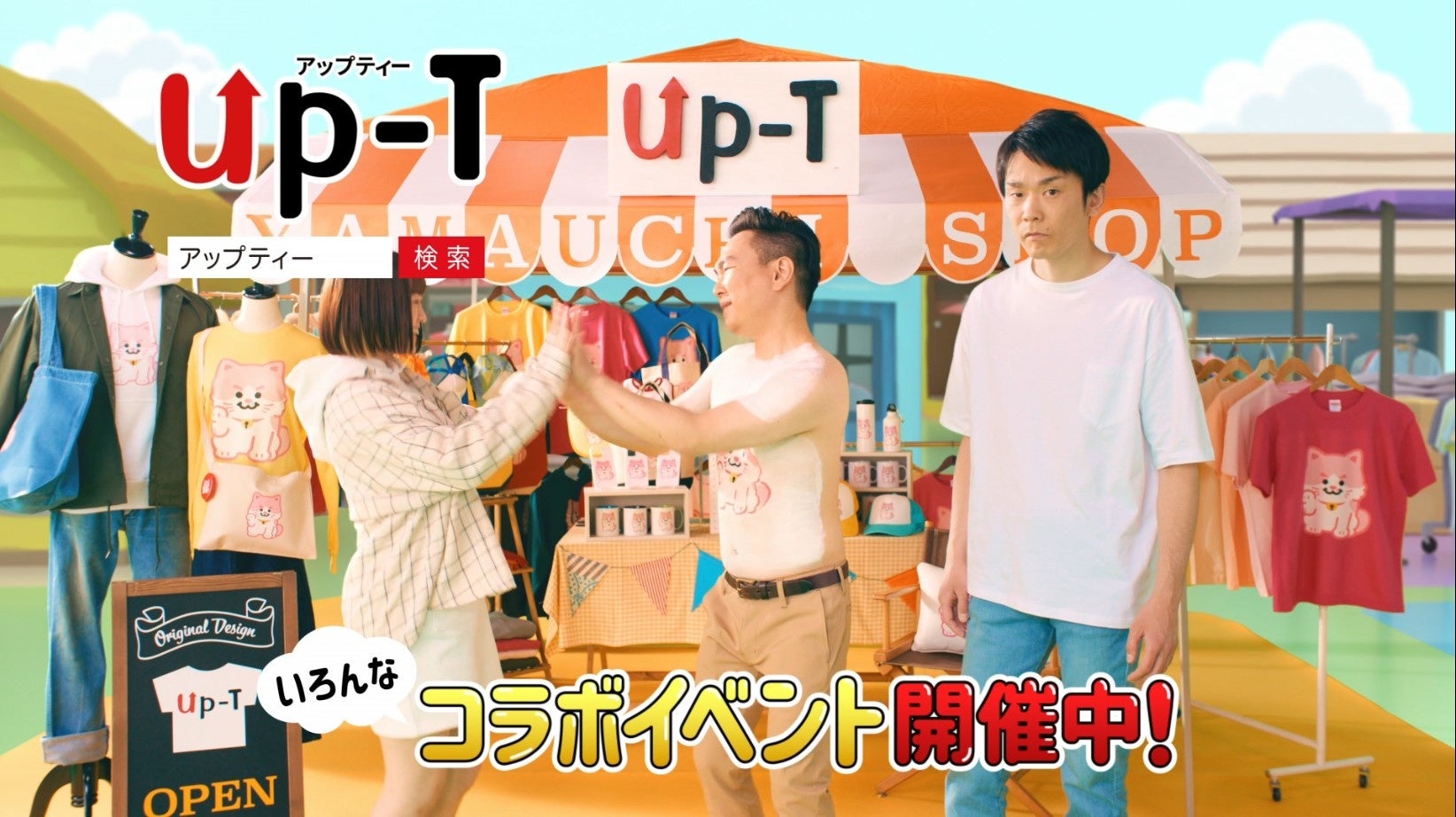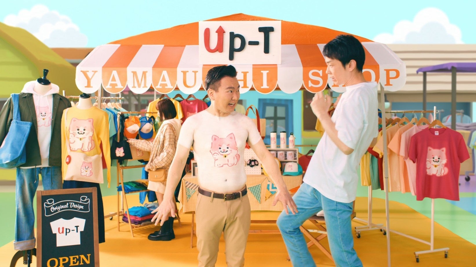 新CMの「歌モノ」篇では山内さんがまねきネコ、濱家さんがまねきカワウソを着用して登場。Up-Tのオリジナルソングに合わせ軽快に踊る濱家さん、一方山内さんは踊らず不思議な表情を浮かべています。さらに「ボディペイント篇」では山内さんがボディペイントでまねきネコのデザインのTシャツを着用しているような仕掛けに挑戦。「着てませんよね?」、「着てます」という2人のやりとりなど楽しいCMとなっています。