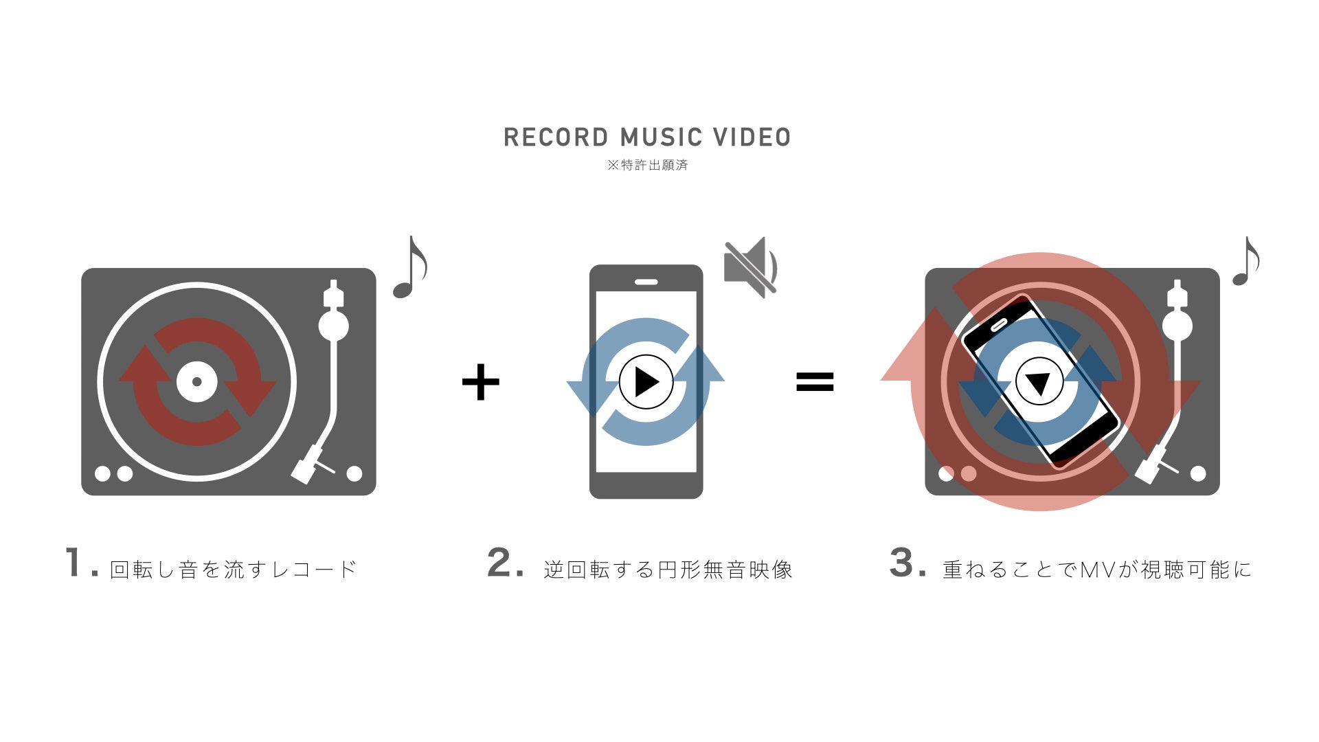 RECORD MUSIC VIDEO(※日本特許出願済)は、アナログレコード盤とスマートフォンを組み合わせることで初めて視聴が可能になるミュージックビデオシステムである。動画の再生に特殊なアプリは必要なく、レコードプレイヤーとスマートフォンがあれば誰でもコンテンツを楽しむことができる。33RPMや45RPMなど所定速度で回転するレコードと同速度逆回転する無音映像を制作し、これを回転するレコード上に載置することで初めて映像視聴が可能となる。スマートフォンを載置する際には、市販のレコードスタビライザーを利用。レコードプレーヤーの上から覗き込み、スマートフォンの画面が円形に広がる映像の世界を切り取る、不思議な視聴体験を提供する。第一弾コラボレーションとしてアーティストShin Sakiura氏の楽曲「komorebi feat.BASI」のアナログレコードEP盤にシステムへの提供を行い、その後も展示「RECORD MUSIC VIDEO GALLERY」や、テキサス州オースティンで行われている大規模イベント「SXSW2022」出展を始め、様々な場所で活用されている。