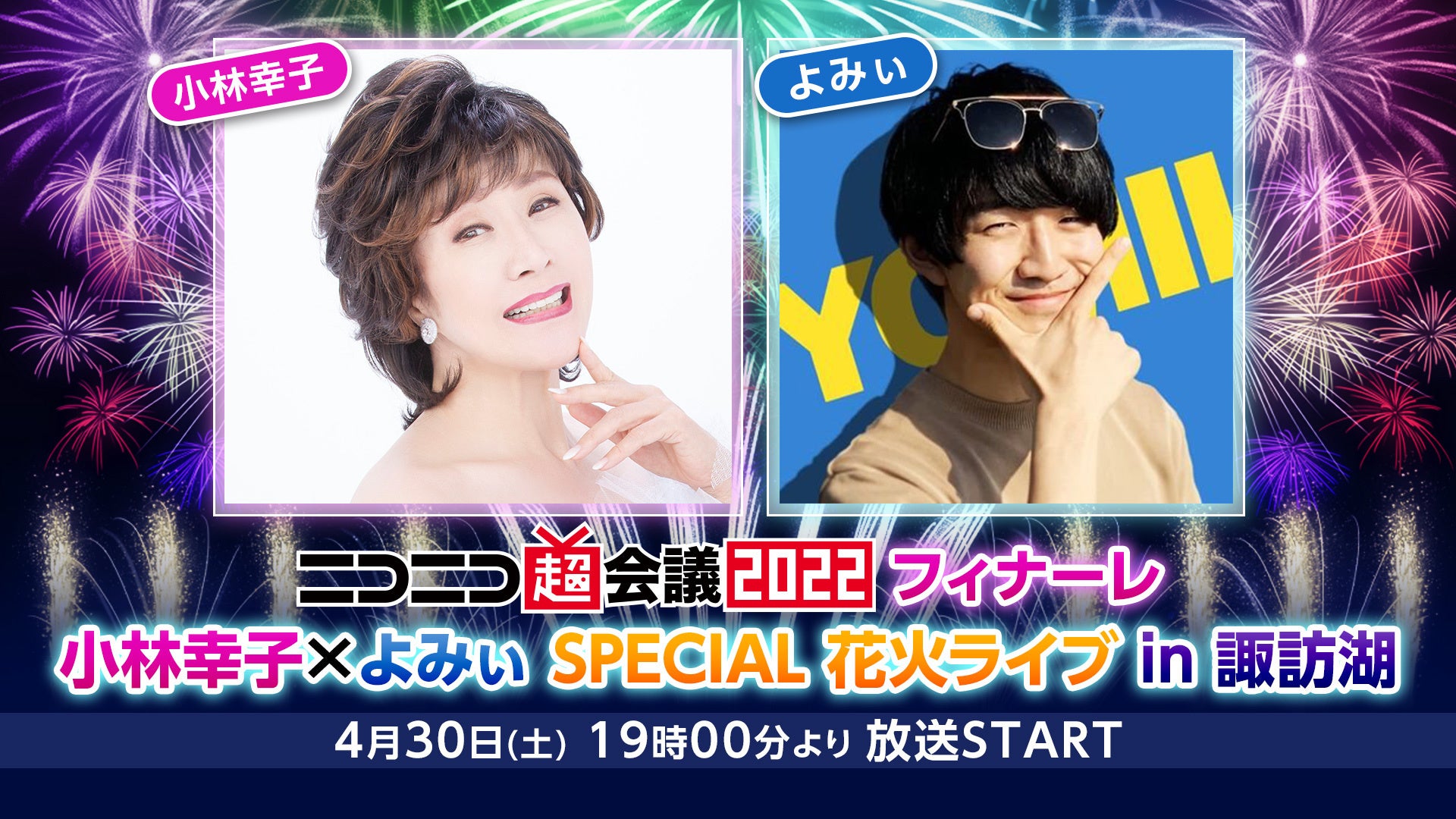 株式会社ドワンゴ(本社:東京都中央区、代表取締役社長:夏野剛)は、インターネットの祭典「ニコニコ超会議2022」(開催期間:2022年4月23日~4月30日)のフィナーレとして、4月30日(土)19時より、長野県諏訪市の諏訪湖にて「小林幸子 x よみぃSPECIAL 花火ライブ」を開催します。
