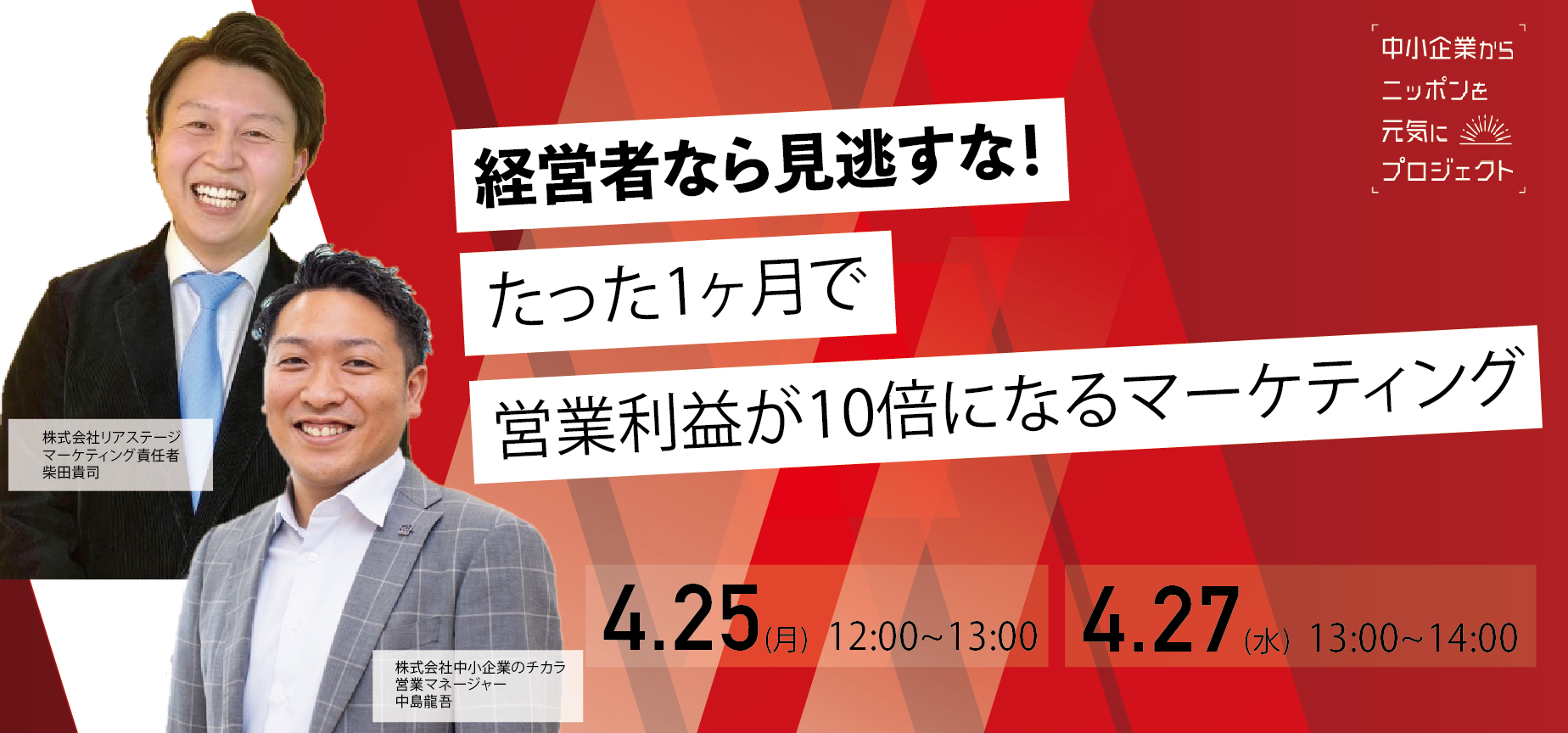 中小企業支援(ブランディング、WEB マーケティング、SDGs支援)事業を行う株式会社中小企業のチカラ(本社:東京都渋谷区、代表取締役社長:山下 佳介、以下「中小企業のチカラ」)( https://nippon-smes-project.com/ )が運営する『中小企業からニッポンを元気にプロジェクト』は、4月25日・4月27日に、今ある仕組みはそのままで「webマーケティング経由の営業利益を最大化させたい!」と考えている経営者必見の無料ウェビナーを開催いたします。
