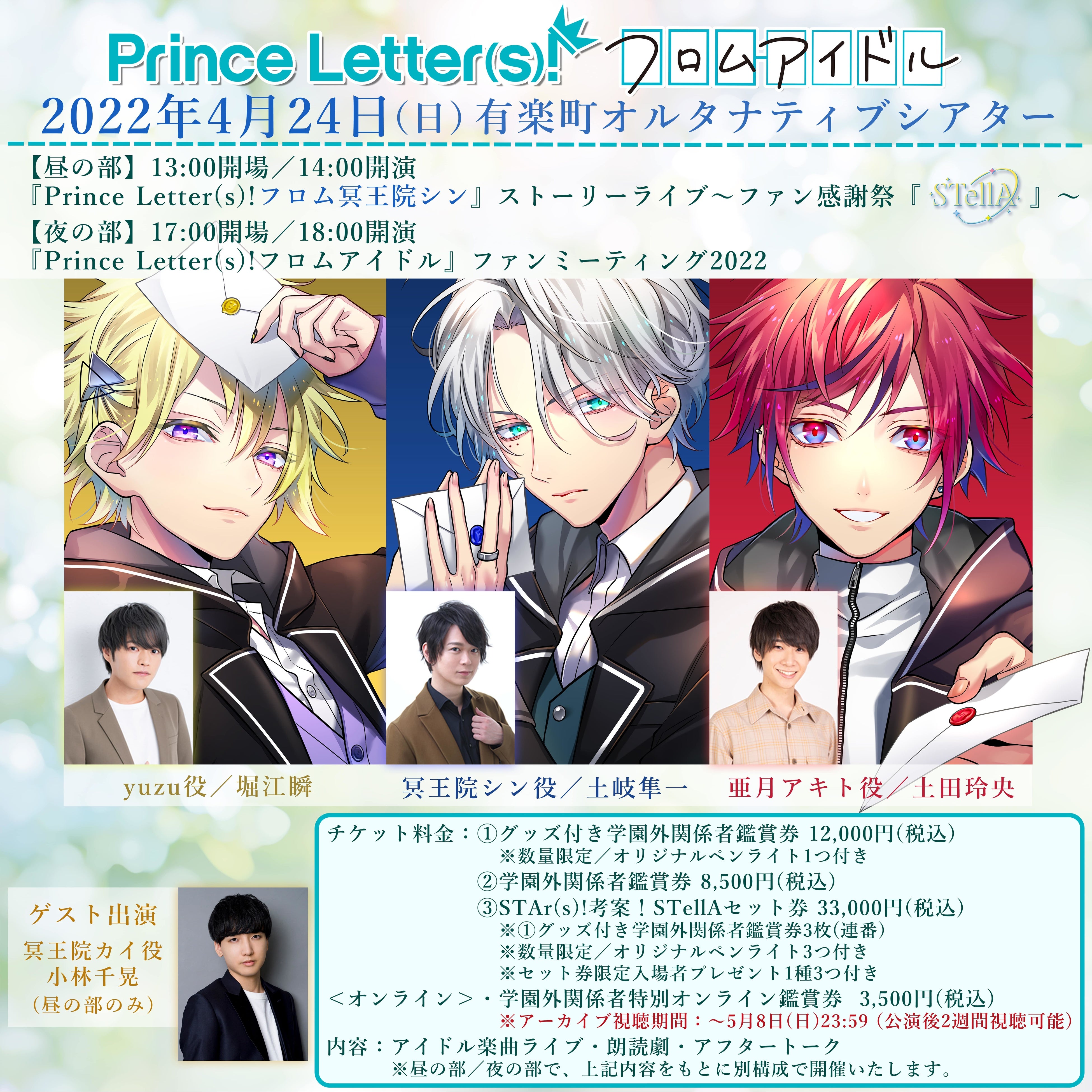 昼の部はボイスドラマ本編と連動した「『Prince Letter(s)! フロム冥王院シン』ストーリーライブ~ファン感謝祭『STellA』~」、夜の部は一周年を記念した「『Prince Letter(s)! フロムアイドル』ファンミーティング2022」と、二部構成で実施される4月24日(日)のイベント。この度たくさんのご要望の声にお応えして、オンライン生配信を実施することが決定いたしました。今回は二週間のアーカイブ期間を設定しておりますので、公演終了後から5月8日(日)23:59まで、何度でもご視聴いただけます。STAr(s)!の亜月アキト(CV:土田玲央)、yuzu(CV:堀江瞬)、冥王院シン(CV:土岐隼一)の3名に加えて、昼の部にはスペシャルゲストとして冥王院カイ(CV:小林千晃)も登場。昼の部、夜の部は別構成でアイドル楽曲ライブ、朗読劇、アフタートークをお届けいたしますので、どちらもぜひチェックしてみてくださいね。なお、引き続き会場で鑑賞できるチケットの一般販売も実施しておりますので、合わせてご検討ください。(チケット販売サイトはこちら→https://l-tike.com/prince-letters-0424