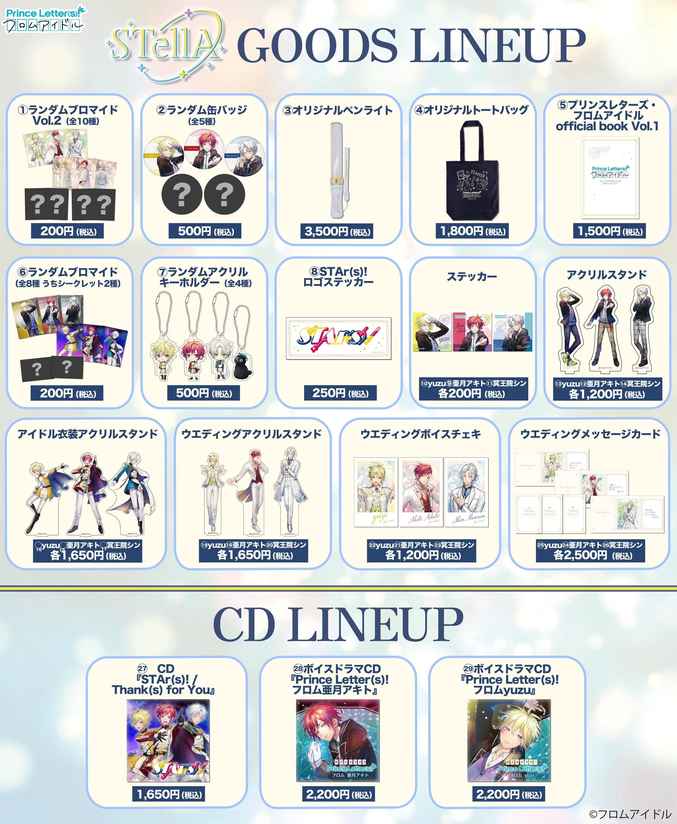 この度会場で販売される『Prince Letter(s)! フロムアイドル』公式グッズのラインナップが公開されました。昼の部、夜の部ともにアイドル楽曲の披露があるため、今回は『Prince Letter(s)! フロムアイドル』初となるオリジナルペンライトも販売いたします。グッズ付き鑑賞券と同様のものになりますが、ぜひ一本ご持参いただき、当日はこのペンライトを振りながらお楽しみください。また、新商品のランダムブロマイド、ランダム缶バッジの発売も決定いたしました。シークレット商品もございますのでお手に取っていただき、お客さまの目でご確認ください。なお、公式通販サイトフルービー(https://froovie.jp/shop/c/cPrince/)にてすでにペンライトは販売中、ランダムブロマイドとランダム缶バッジは4月24日0時より販売がスタートいたしますので、会場にお越しいただけないお客さまは公式通販サイトをチェックしてみてください。会場物販で3500円(税込)ご購入いただくと、豪華景品が当たるくじ引きに参加できるキャンペーンを実施することも決定しました。ここでしか手に入らないプレゼントも多数ございますので、気になる商品がありましたらぜひこの機会にお買い求めください。