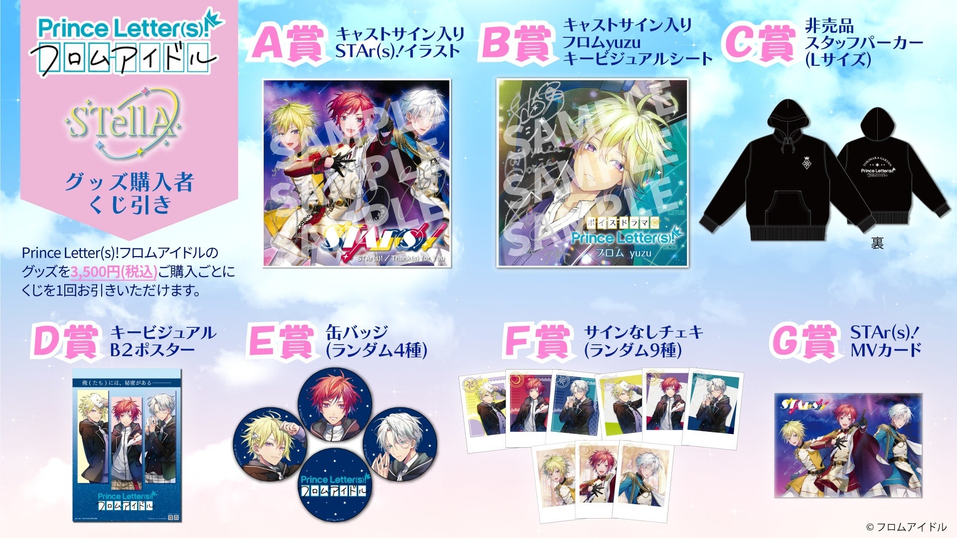 フロムアイドル運営事務局(松竹株式会社)はいま注目の声優 土田玲央、堀江瞬、土岐隼一を起用した「文通もできる」アイドルプロジェクト『Prince Letter(s)! フロムアイドル』( https://twitter.com/prince_letters )より、4月24日に開催される「『Prince Letter(s)! フロム冥王院シン』ストーリーライブ~ファン感謝祭『STellA』~」(昼の部)、「『Prince Letter(s)! フロムアイドル』ファンミーティング 2022」(夜の部)のオンライン生配信を実施することを発表いたしました。さらに、当日会場で行われる物販の商品一覧と、3500円ごとに1回引けるくじ引きの詳細も明らかになりました。また、カラオケパセラでのコラボレーションメニューの販売やカラオケJOYSOUNDでの楽曲配信、バーチャルくじびきの実施など、様々な展開が決定いたしました。