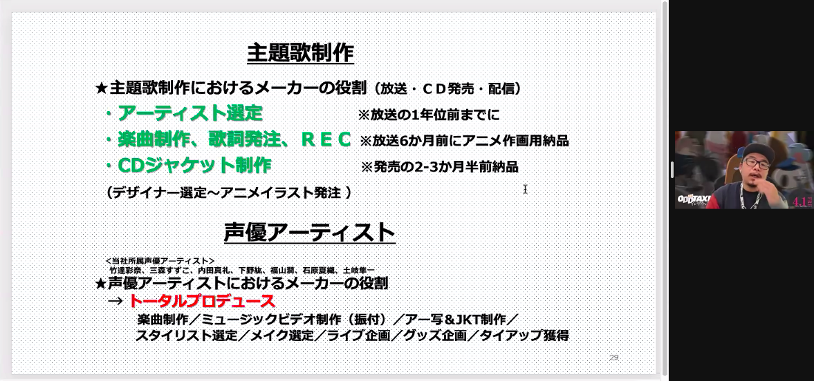最後は、音楽プロデューサーについて。「音楽商品企画、制作・進行管理、予算管理をする責任者。ポニーキャニオンでは、作詞作曲、編曲、演奏をする仕事ではないです。主に、主題歌制作、劇伴(BGM)やキャラソン制作、声優アーティストのプロデュースなどを行います」と説明。その流れで、主題歌制作の工程や声優アーティストのトータルプロデュースについても語り、就活生の興味を惹いていました。