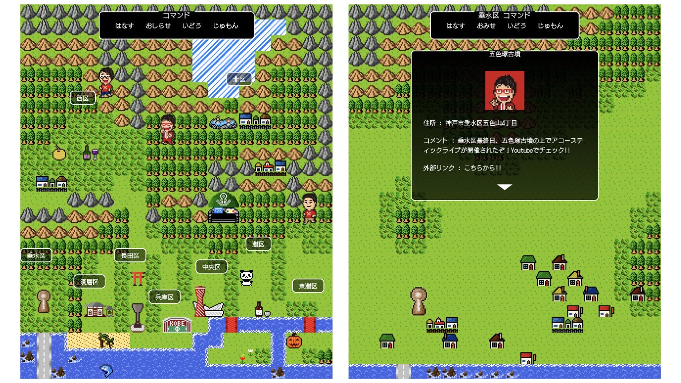 各区を1ヶ月間探索し、景色や隠れた名所、出来事、人との出会いなど。神戸市全9区すべての街に住むという前人未到の企画を終え完成した『神戸に住むで神戸へおいでスペシャルサイト』の美麗なドット絵による圧倒的なグラフィック、超ハイクオリティ8bit音源による未体験の臨場感、親しみ深い古き良きRPG風MAPで、あなたがまだ知らない「神戸の魅力」をぜひご堪能ください。またMAPは随時更新されていきます。