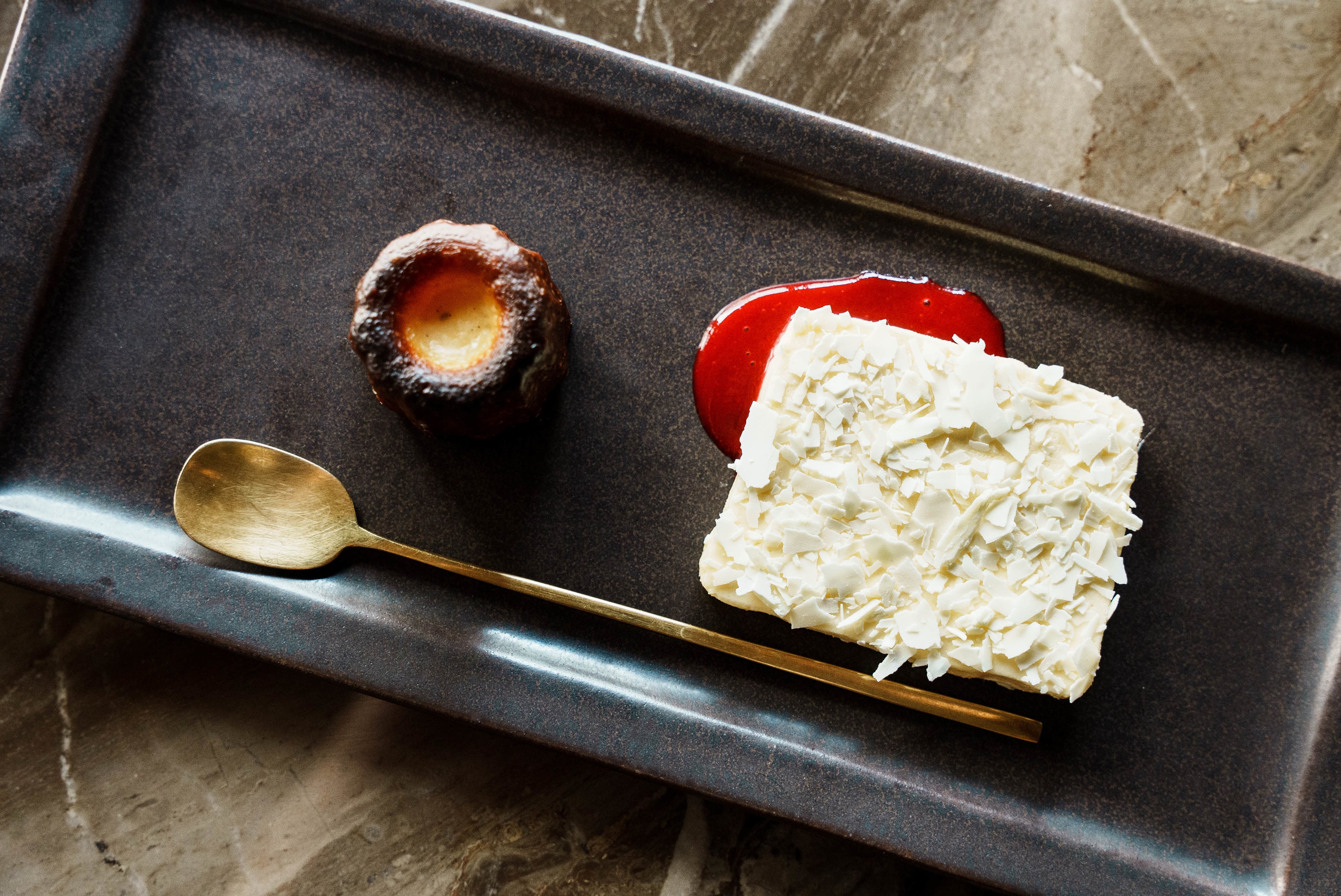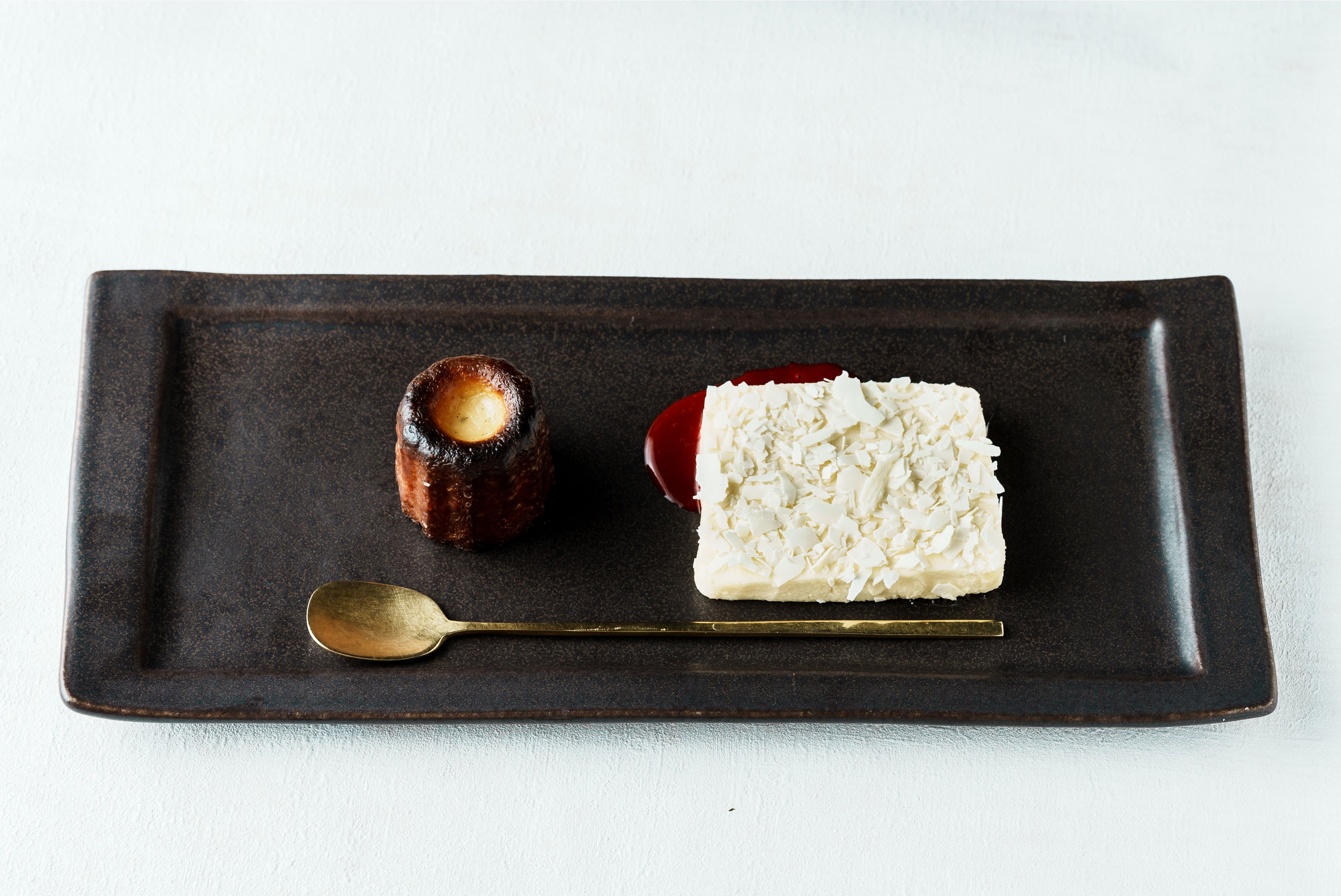 甘酸っぱいフランボワーズソースを添え、飽きのこない食感に仕立てるために上からホワイトチョコレートチップをかけました。フルーツの香りと酸味がホワイトチョコレートの甘さを和らげバランスの良い味わいに。バニラ香るカヌレと合わせることで、より一層の上品な味わいが楽しめます。