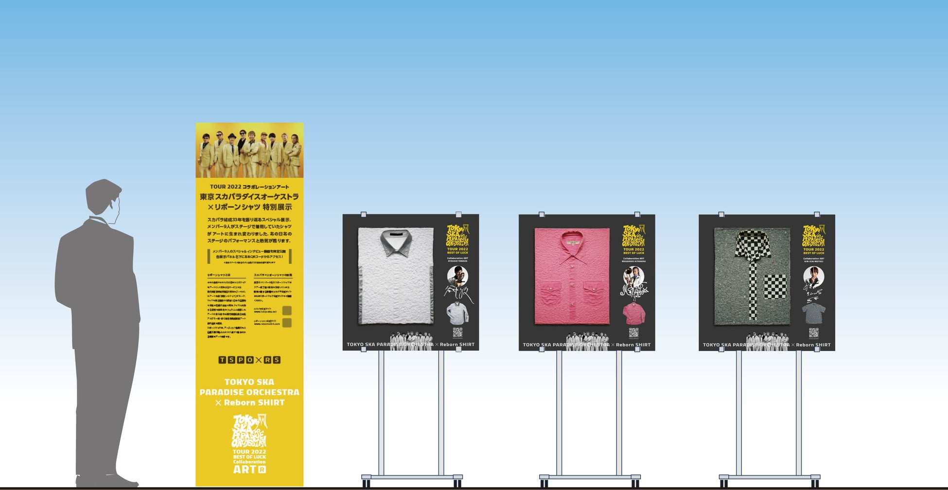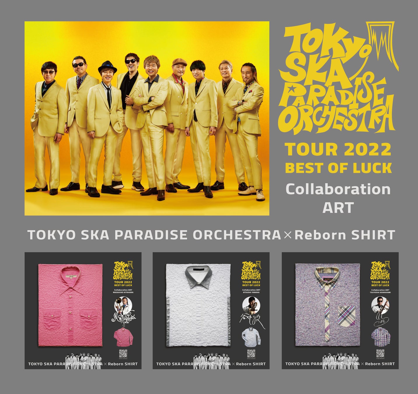株式会社ARIGATO MUSIC(所在地:東京都千代田区、代表取締役:南部喨炳)はX ART home(バイアートホーム、所在地:東京都中央区、代表者:大嶋フクヲ)と共同で、着なくなりモノとしての役目を終えたシャツをまったく新しいアートとしてよみがえらせるプロジェクト「Reborn SHIRT」の公式サイトをオープンしました。そのコラボ第一弾として、今年でデビュー33周年を迎える東京スカパラダイスオーケストラの2022年全国ツアー「BEST OF LUCK」会場のウェルカムアートとして、過去のステージ衣装をアップサイクルした「Reborn SHIRT」を展示いたします。