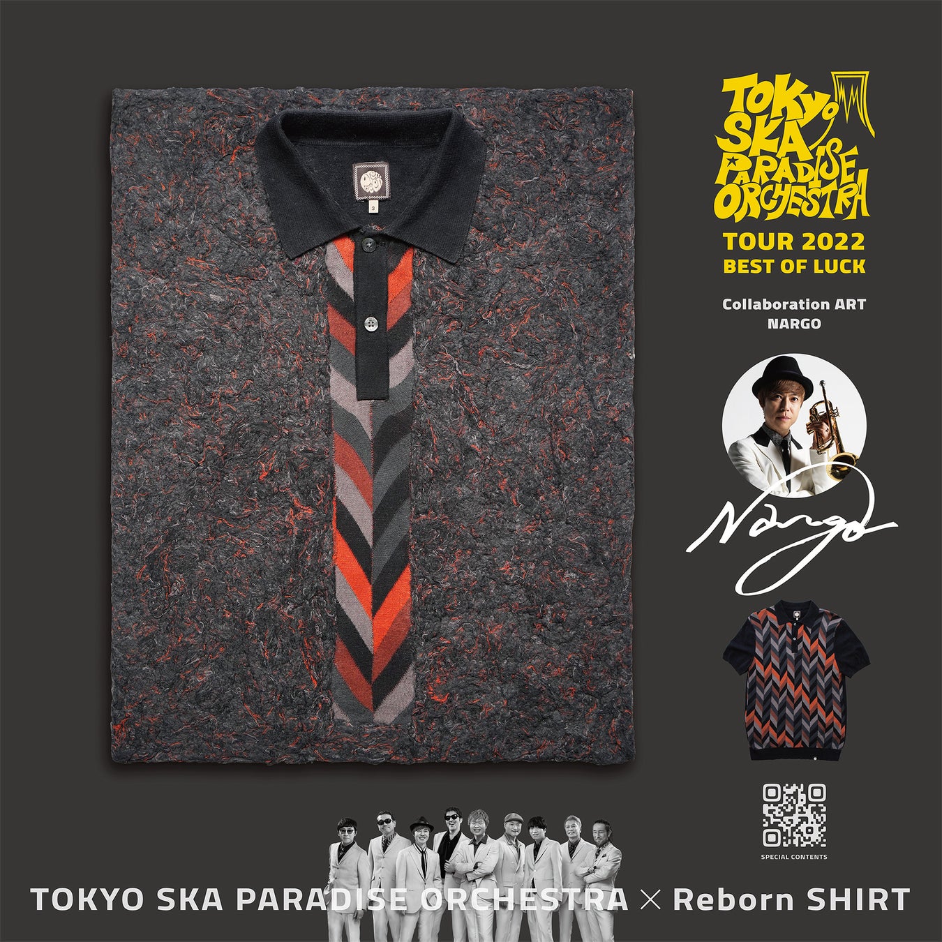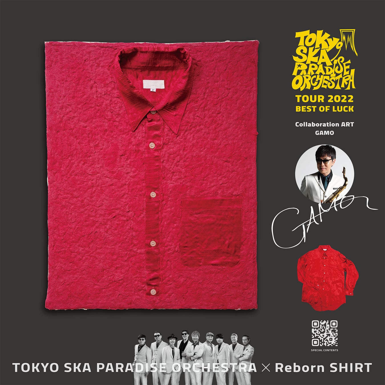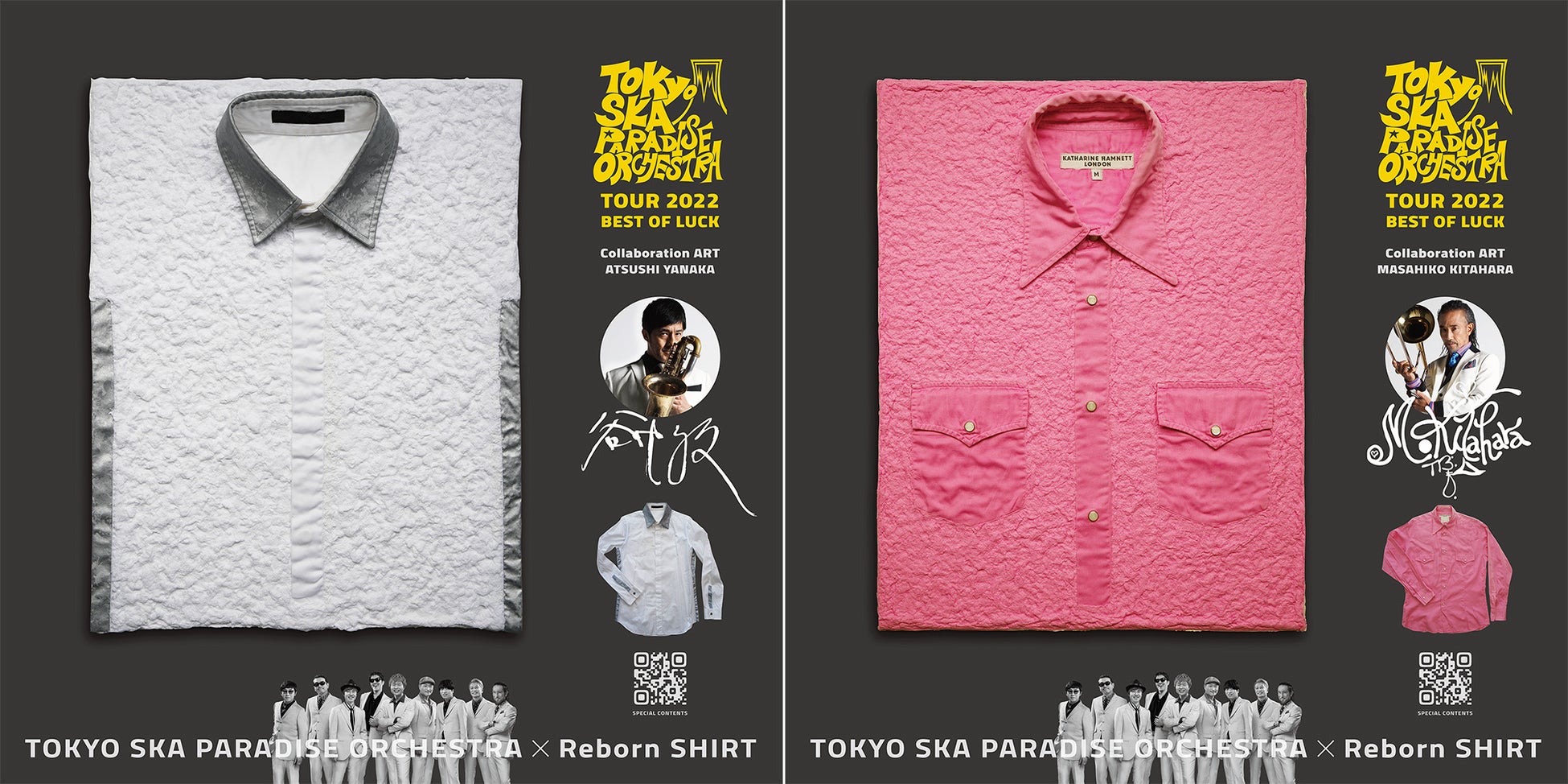 現代美術家の鈴鹿芳康氏の監修のもと、日本の伝統技術である和紙漉きの手法により、愛用していたシャツをアートに生まれ変わらせる「Reborn SHIRT」。今回のコラボレーションでは、東京スカパラダイスオーケストラの過去のステージ衣装をアップサイクルし、4月21日から7月27日まで開催される2022年全国ツアー「BEST OF LUCK」会場のロビーにウェルカムアートとして展示。ツアー終了後に抽選販売いたします。