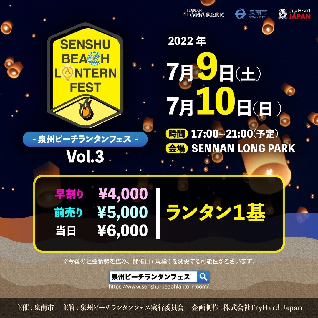 泉南市のシティープロモーションの一環として、株式会社トライハードジャパン(所在地:大阪市中央区)は、スカイランタン(天灯)に願いをのせて一斉に夜空へ打ち上げるイベント「泉州ビーチランタンフェスVol.3~夜空に舞う灯りに願いをのせて~」を、2022年7月9日(土)、10日(日)の2日間開催いたします。