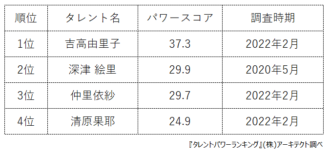 『タレントパワーランキング』では、タレントパワーランキングに登録されている芸能プロダクション「アミューズ」に所属している女優のスコアを調査。