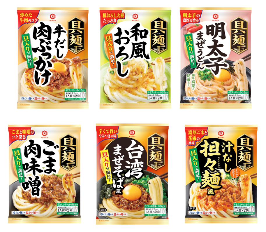 「牛だし肉ぶっかけ」「和風おろし」「明太子まぜうどん」「ごま肉味噌」「台湾まぜそば風」「汁なし担々麺風」