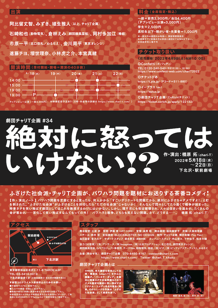 劇団チャリT企画『絶対に怒ってはいけない!?』が2022年5月18日 (水) ~2022年5月22日 (日)に駅前劇場(東京都世田谷区)にて上演されます。チケットはカンフェティ(運営:ロングランプランニング株式会社、東京都新宿区、代表取締役:榑松 大剛)にて発売中です。