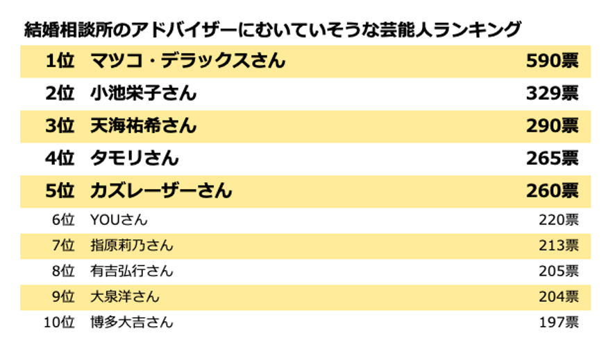 今回の調査では、結婚相談所のアドバイザーにむいている芸能人をアンケートで答えてもらいました。結果をランキングでご紹介いたします。