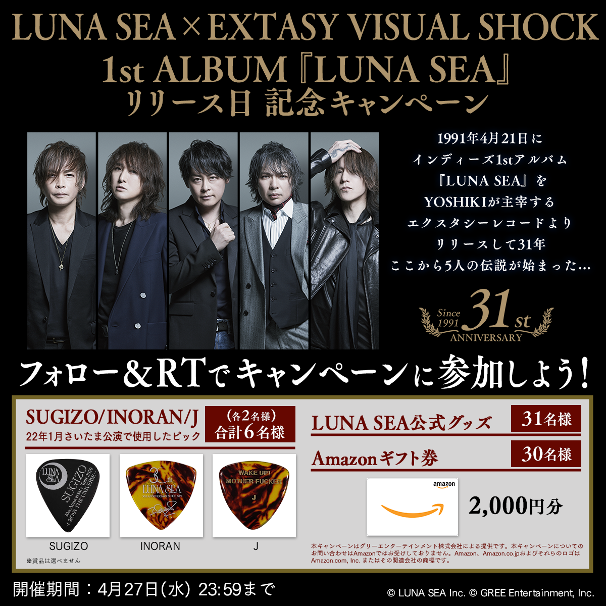 1991年4月21日、Extasy RecordsよりLUNA SEAのインディーズ1stアルバム『LUNA SEA』がリリースされました。それを記念して、EXTASY VISUAL SHOCK公式Twitterではフォロー&RTキャンペーンを実施中です!