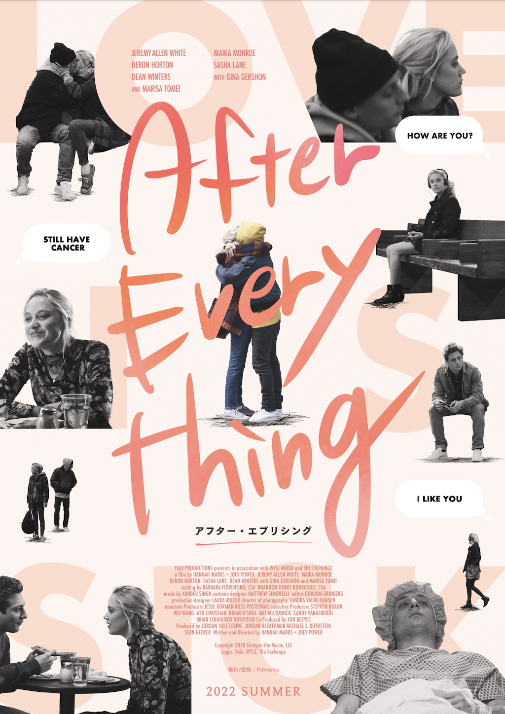 概要:株式会社つみき(代表取締役社長:鈴木貴幸、本社:東京都目黒区)が運営する国内最大級の映画やドラマ、アニメのレビューサービス「Filmarks(フィルマークス)」は、日本初公開となる洋画『アフター・エブリシング』を提供することをお知らせします。この度、日本版ビジュアルと予告編を解禁。2022年夏よりヒューマントラストシネマ渋谷他で順次公開予定。チケット販売はFilmarksの映画館上映企画サイト「プレチケ」にて限定販売致します。
