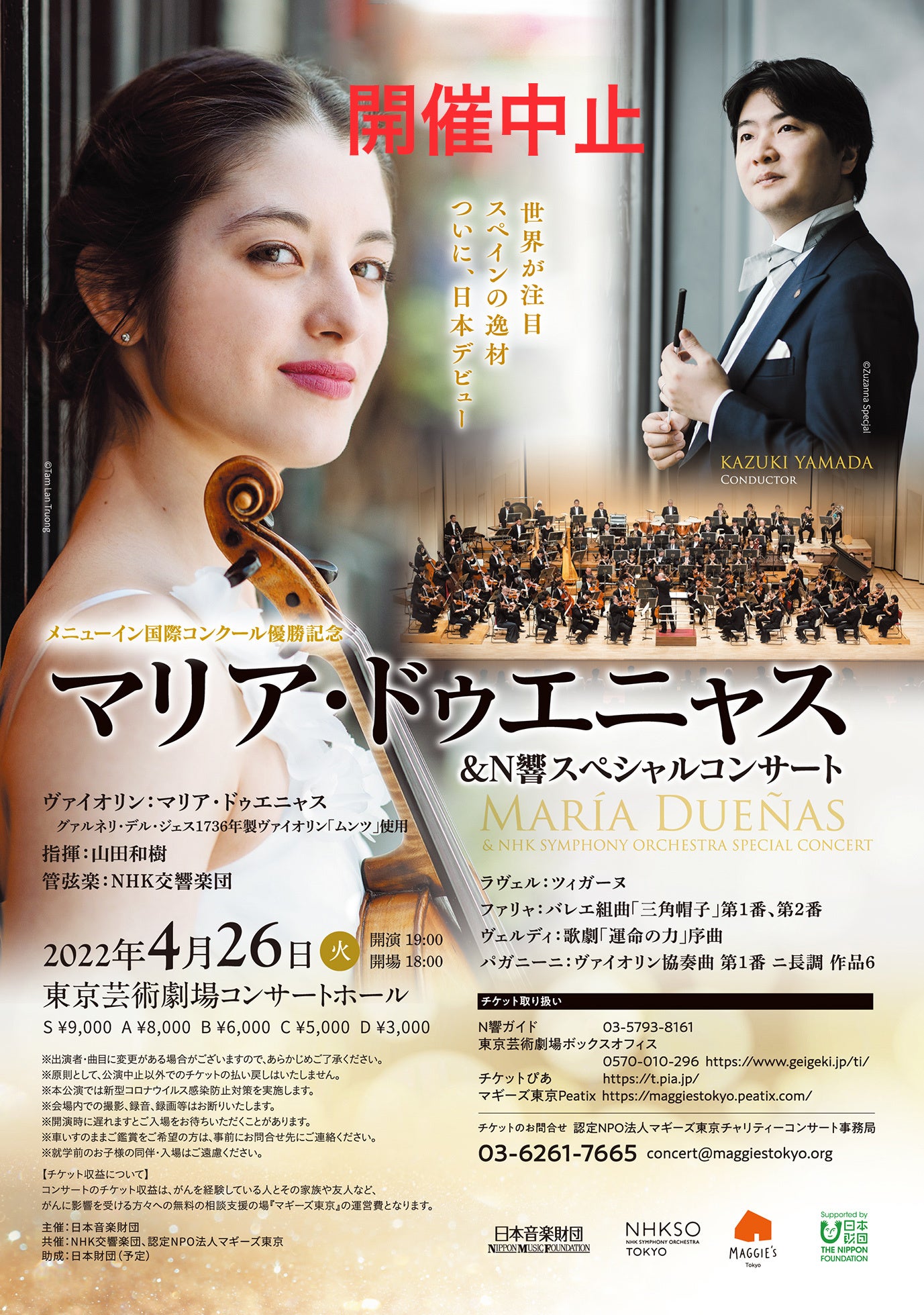 2022年4月26日(火)に東京芸術劇場にて開催を予定しておりました「マリア・ドゥエニャス&N響スペシャルコンサート~メニューイン国際コンクール優勝記念~(マギーズ東京チャリティコンサート)」について、ヴァイオリニストのマリア・ドゥエニャスさんの体調不良により、中止することが決まりました。ご来場を楽しみにされていたお客様にご迷惑をおかけすることをお詫び申し上げるとともに、ご理解を賜りますようお願い申し上げます。