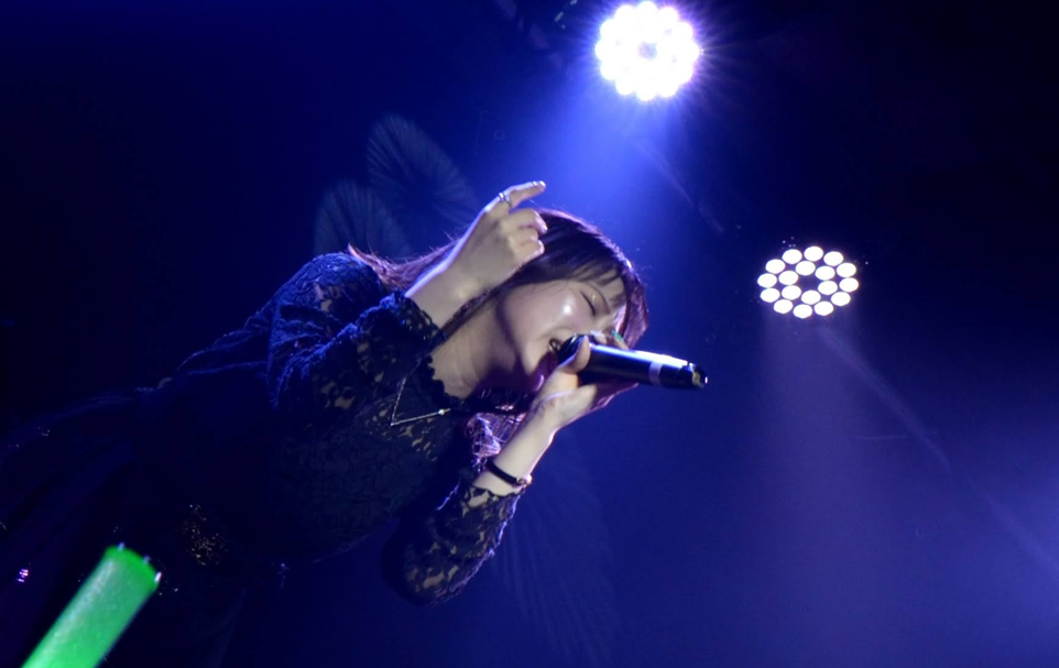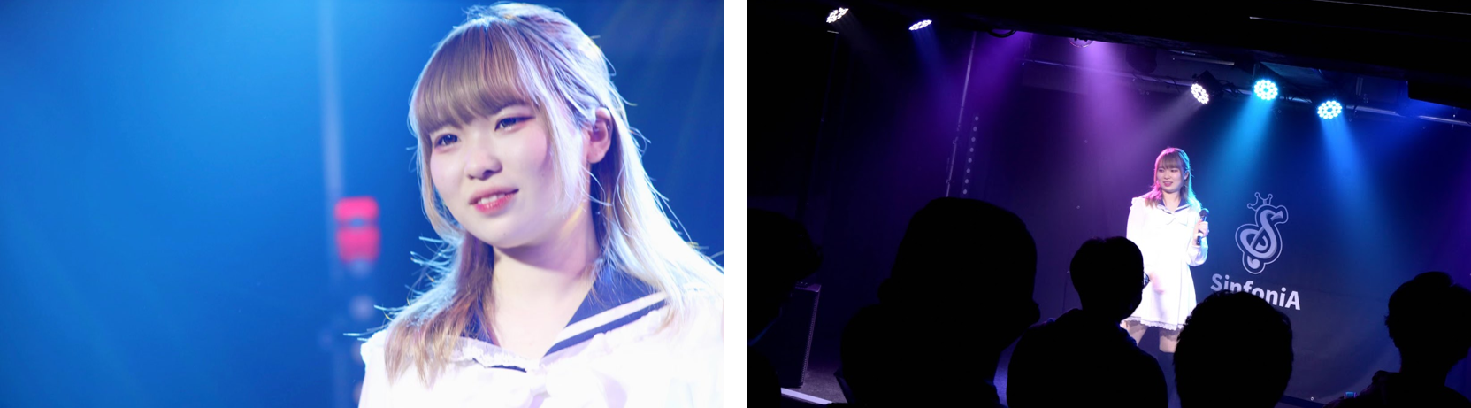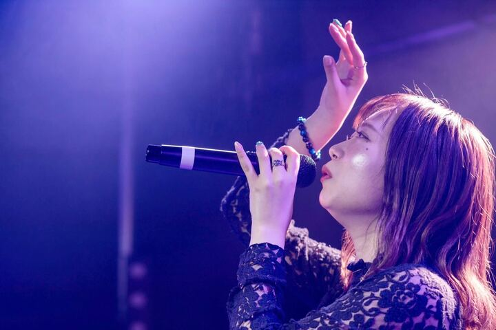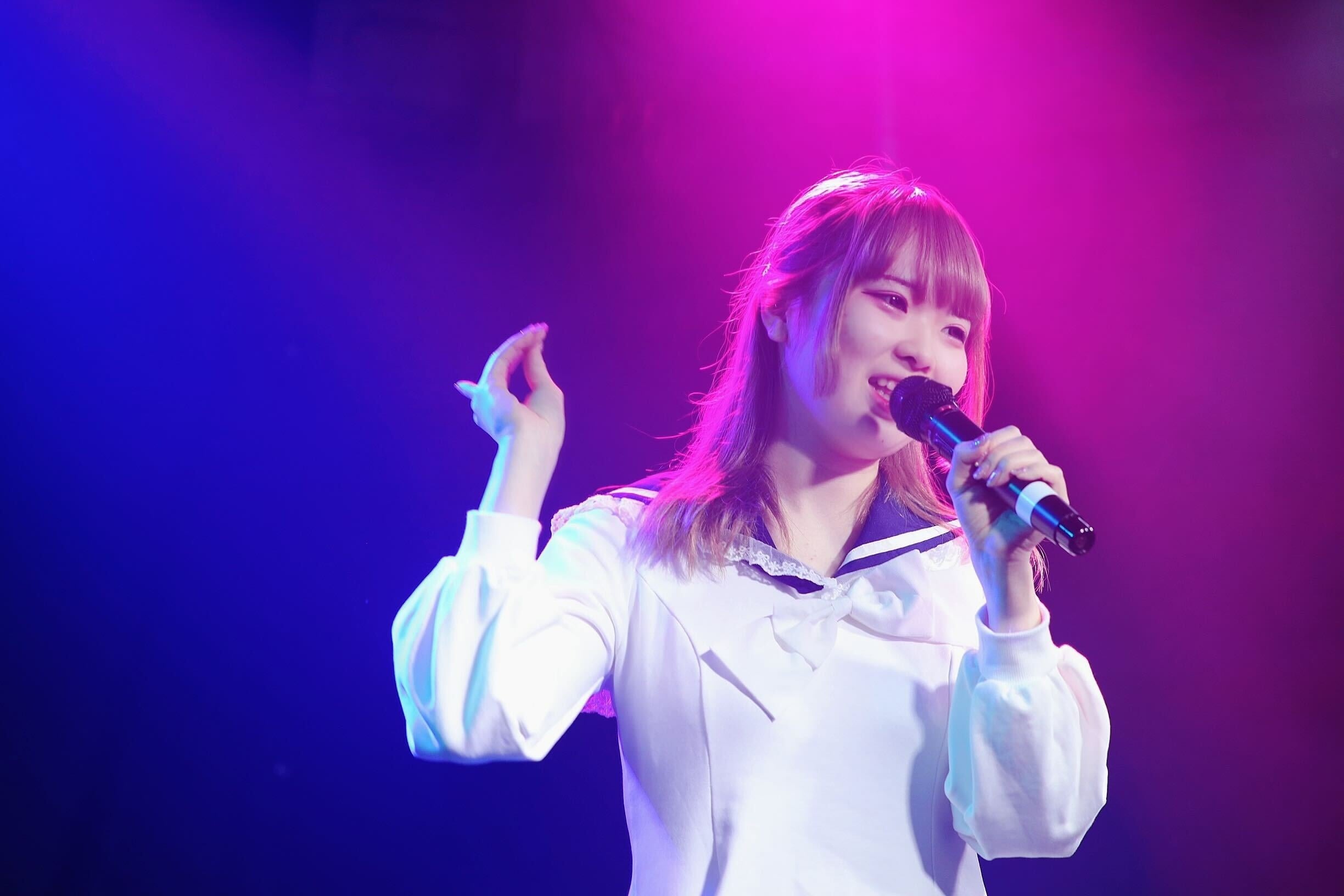 2番手はスターライトノベル所属・めのう(https://twitter.com/mnu0802)。高く透明感のある歌声でテクノサウンドな楽曲を立て続けに3曲披露。プチハプニングも笑顔で乗り越え、来場者の場をなごませる一面を魅せた。