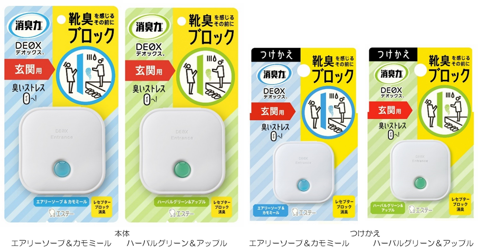 今回新発売の用途では、玄関の靴臭を感じにくくする芳香成分を配合し、ニオイの原因分子をブロックします。