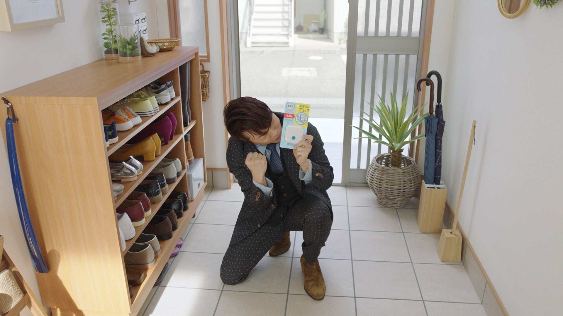 ある雨の日に傘をくれた小学生に、西川貴教さんが恩返し訪問するストーリーです。恩返しの品として『消臭力 DEOX 玄関用』を持参し、玄関の靴のニオイをブロックする〔レセプターブロック消臭〕機能について、全力のパントマイムで商品説明を披露していただきました。