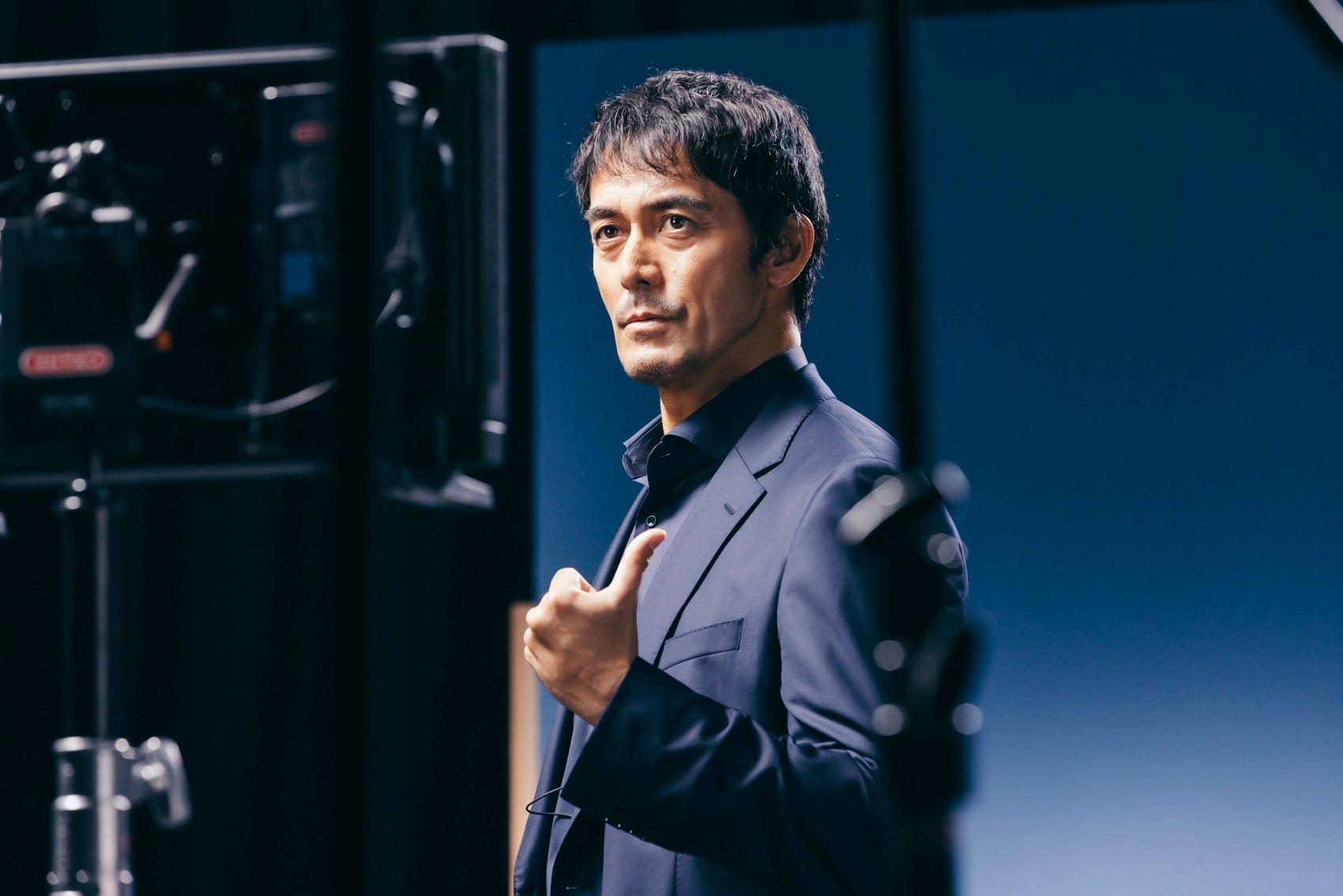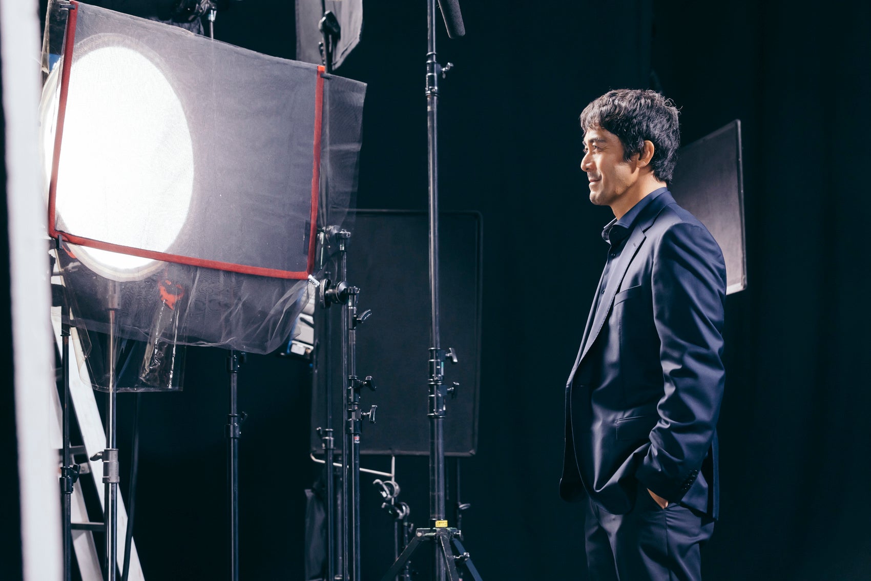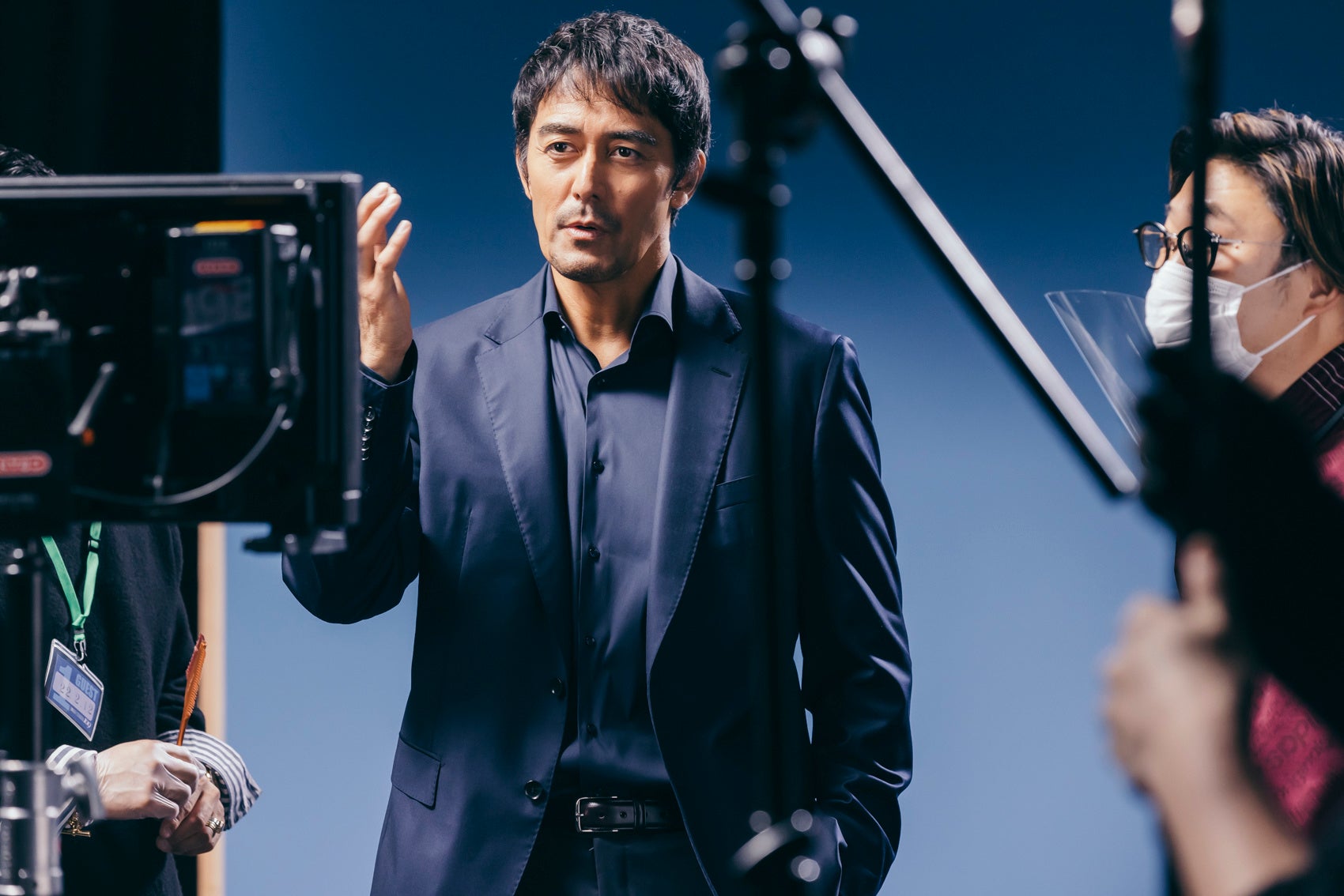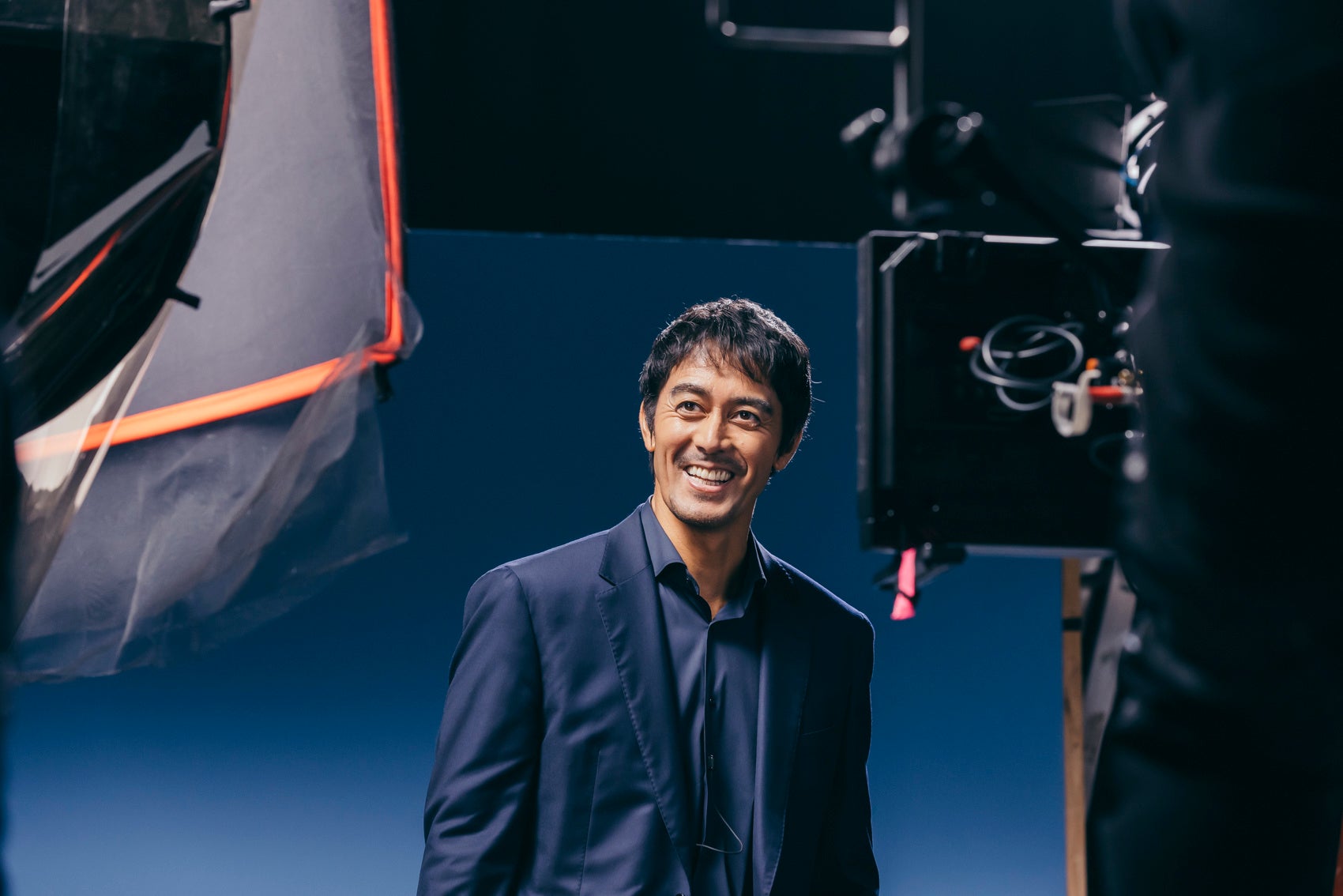 濃紺のジャケット姿で現場入りするや否や、その堂々たる佇まいと圧倒的なオーラで、スタッフの視線を釘付けにしていた阿部さん。撮影にあたり、監督との話し合いで挙がった「直接言葉で語るよりも伝わる表現」を念頭に、製品イメージカラーの空間をバックにしたセットに立ちました。今回の阿部さんに求められたのは、カメラの向こうにいる視聴者の皆さんに対して、直接言葉で語りかけるのではなく、表情と心の声で語りかけるというもの。そのため、本番中の阿部さんはほとんど言葉を発することなく、ひたすら表情とジェスチャーで、映像とともに流れるナレーションに合わせたアドリブのお芝居を続けました。シンプルな内容のCMだけに、阿部さんはどのように演じれば、製品の魅力をより印象的に伝えることができるのかということを常に意識し、ワンテイク毎にプレイバックを確認。その場で浮かんだアイデアも監督と入念に吟味するなど、試行錯誤を繰り返しながら、撮影は終始熱量高く進行しました。