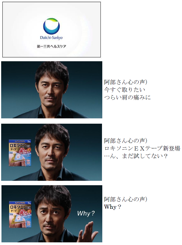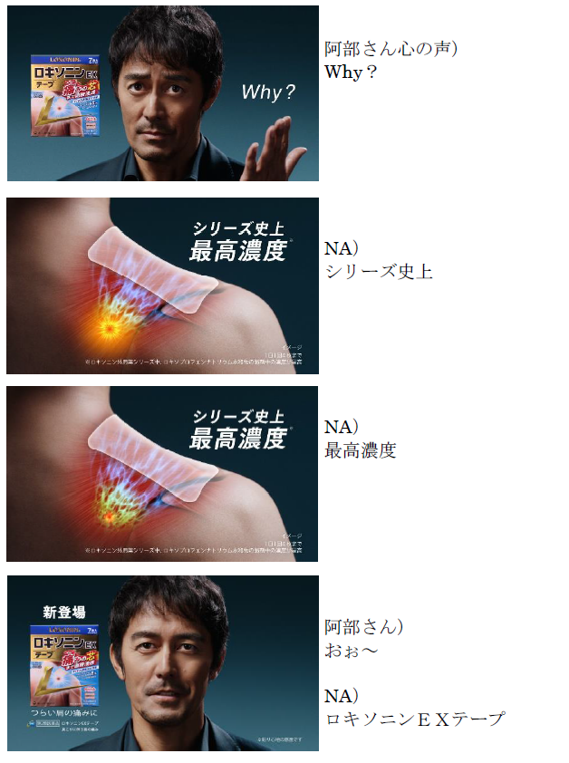 抽象空間に浮かび上がる「ロキソニンEXテープ」の横で、「今すぐ取りたい つらい肩の痛みに ロキソニンEXテープ新登場」という自らの心の声をバックに、強い眼光でカメラを見つめる阿部さん。「…ん、まだ試してない?」「Why?」という心の声に合わせて表情が変化していきます。ここで「シリーズ史上最高濃度※」というナレーションと肩に製品を貼っているCGカットが挿入。画面が切り替わり、自然と「おぉ~」と声が出てしまう、晴れやかな表情の阿部さんのカットに、「ロキソニンEXテープ」というナレーションが重なります。
