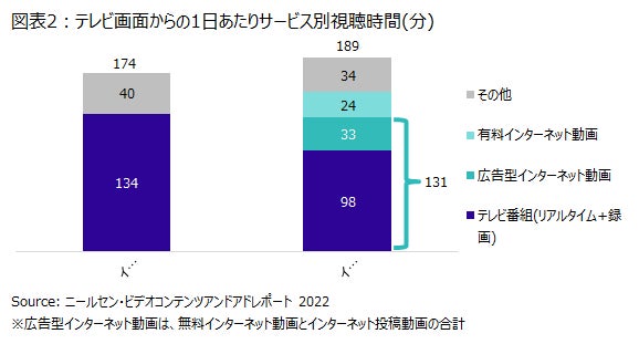 まだテレビ画面でのインターネット動画の利用が浸透していない印象を受けるかもしれませんが、テレビ画面でインターネット動画を視聴する人に絞ってみると、インターネット動画サービスの視聴時間の割合は既にテレビ画面での全視聴時間のうち3割程度を占めています。テレビ画面からのインターネット動画の視聴時間が今後さらに増加すると、リアルタイム視聴や録画テレビ番組視聴などの視聴時間が減少する可能性があることで、テレビ画面での消費者とコミュニケーションを取る接点が減少することを懸念しているマーケティング担当者も多いのではないでしょうか。実際に、リアルタイムと録画テレビ番組の視聴時間は、テレビ画面からインターネット動画を視聴しない人では1日あたり134分であるのに対し、インターネット動画を視聴する人は98分と視聴しない人より短くなっています(図表2)。