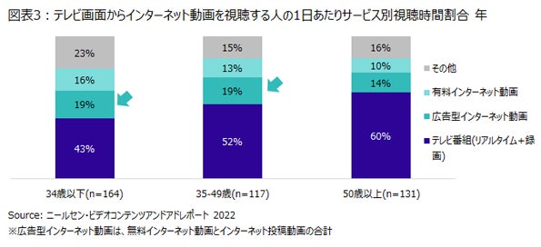 これまでインターネット動画サービスは主に若年層を中心に利用が拡大してきましたが、COVID-19の影響で在宅時間が増加した中、主にスマートフォンで視聴していたインターネット動画を自宅でテレビ画面からも視聴する機会が増えたという人も多いでしょう。特に、もともとインターネット動画の視聴が多い若年層は他の年代よりもテレビ画面からのインターネット動画の視聴が進んでおり、インターネット動画を視聴する人の1日あたりサービス別視聴時間割合を年代別に見ると、34歳以下に加え35-49歳においても広告型インターネット動画が19%を占め、50歳以上の14%よりも高くなっていました。若年層だけに限らず30、40代も含めた広い層に対して、広告型インターネット動画を活用することでコミュニケーションの機会を増やす余地があることがわかります(図表3)。