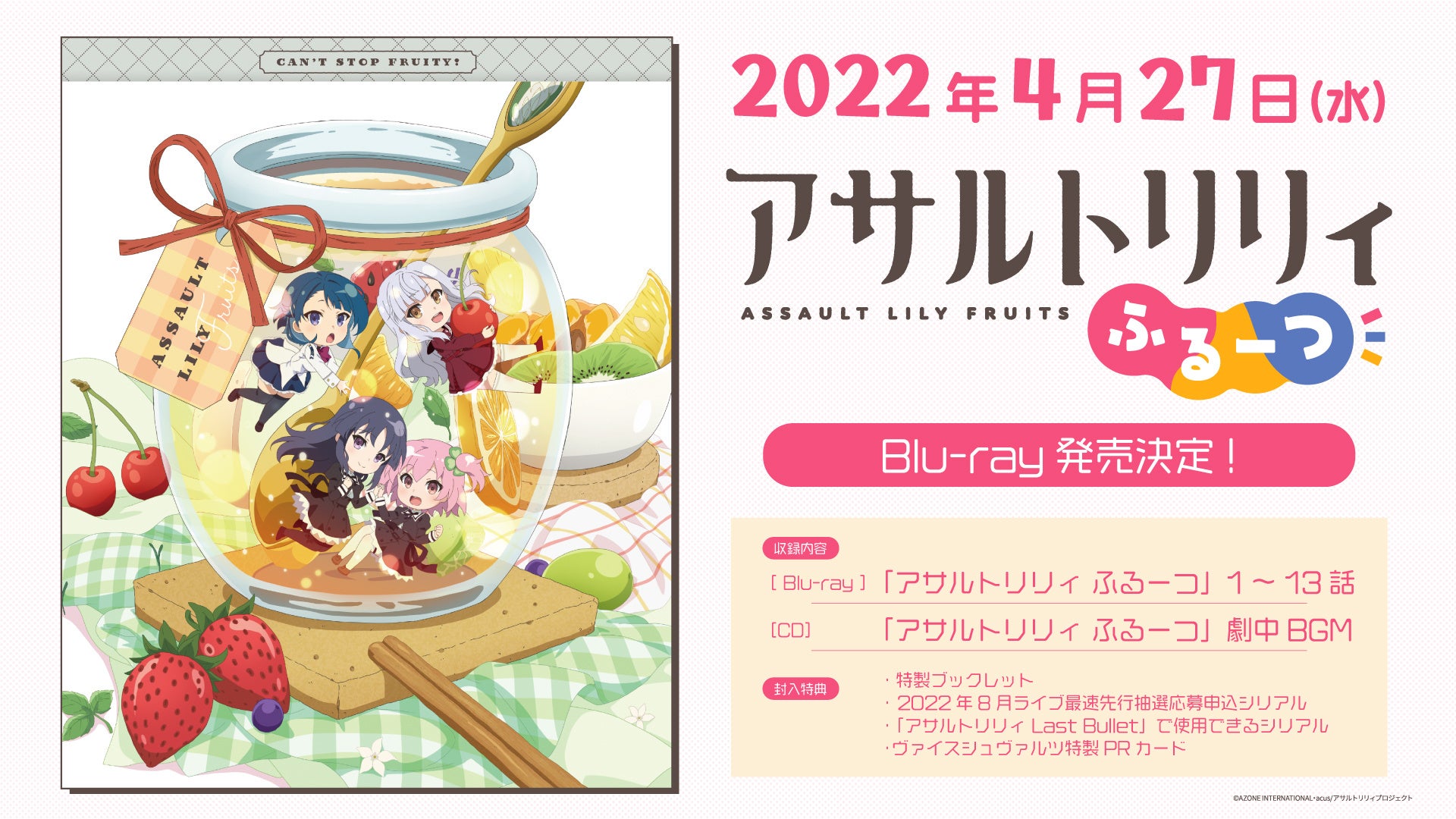 アクションドールシリーズ「アサルトリリィ」を原作とした、シャフト制作のミニアニメ「アサルトリリィ ふるーつ」(発売元:ブシロードミュージック)が本日発売。