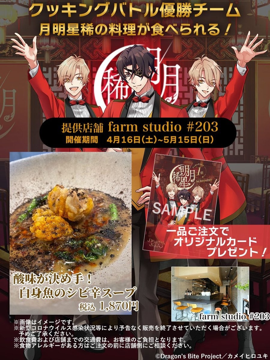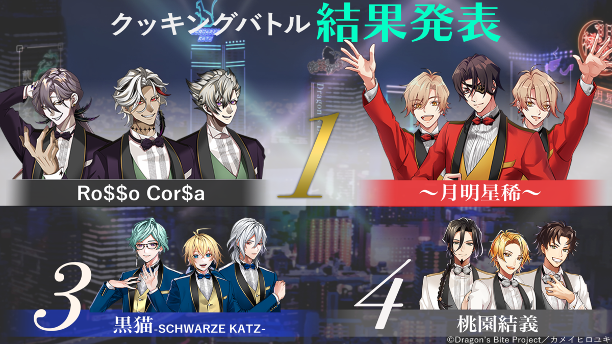 ファン投票の結果、チーム【月明星稀】(つきあきらかにほしまれなり)とチーム【Ro$$o Cor$a】(ロッソコルサ)が同票で優勝となりました。この度、優勝した両チーム考案の料理が、都内有名レストランにて期間限定で提供されます。