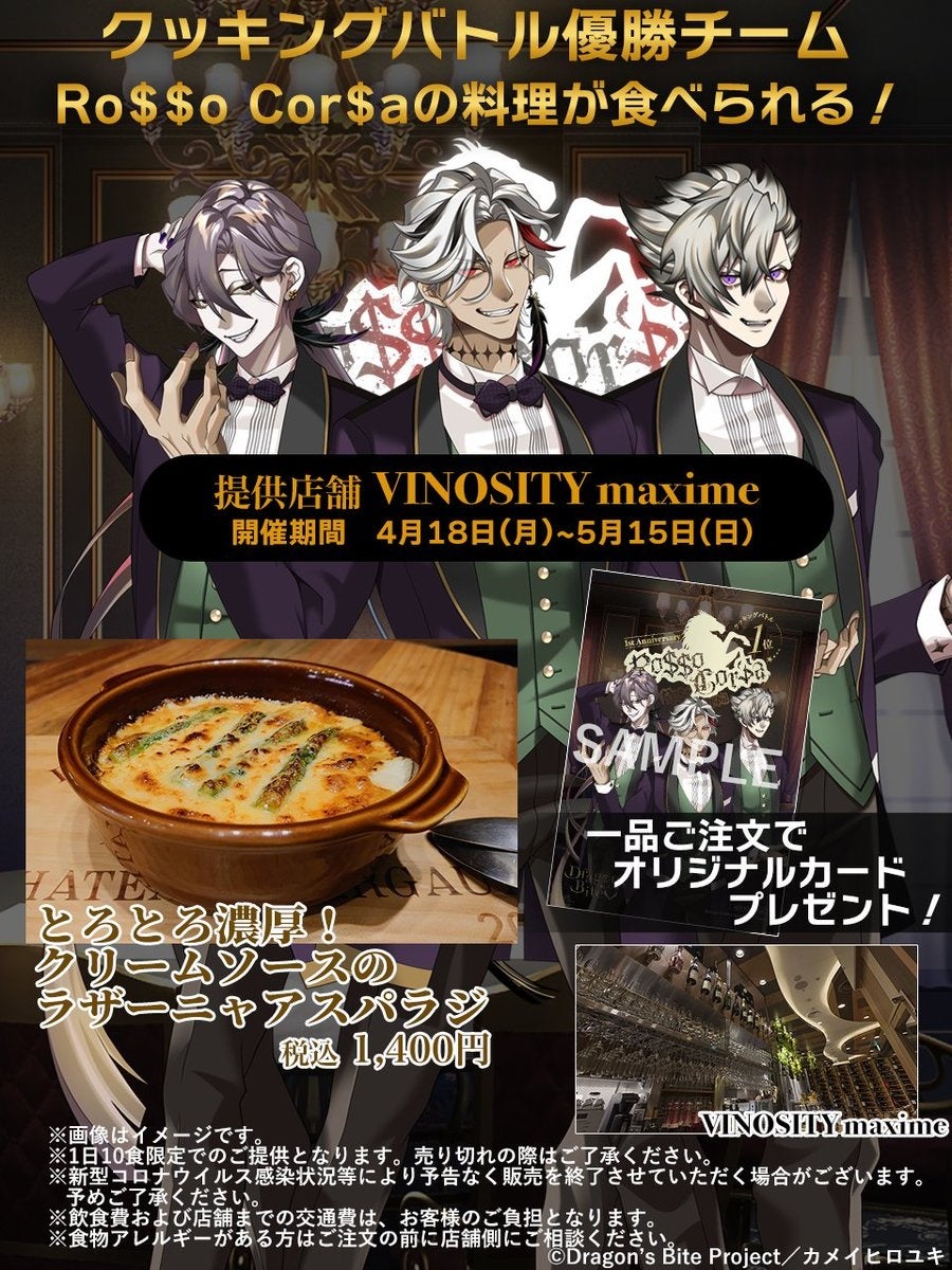 『ドラバイ』1周年を記念した料理バトルを開催され、ファン投票の結果、チーム【月明星稀】(つきあきらかにほしまれなり)と【Ro$$o Cor$a】(ロッソコルサ)が同票で優勝。この度、優勝した両チームの考案料理が、都内有名レストランにて期間限定で提供開始となりました!