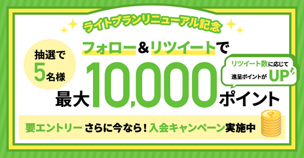 ■「ライトプランリニューアル記念! Twitterフォロー&リツイートキャンペーン 抽選で5名様に最大10,000ポイントプレゼント!」キャンペーン概要