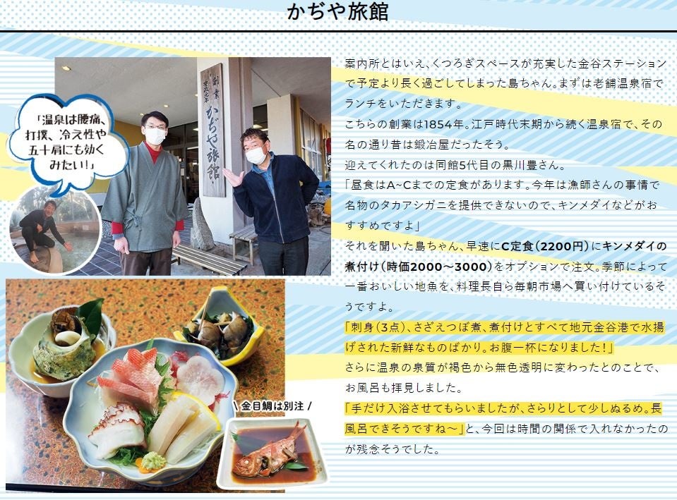 案内所とはいえ、くつろぎスペースが充実した金谷ステーションで予定より長く過ごしてしまった島ちゃん。まずは老舗温泉宿でランチをいただきます。